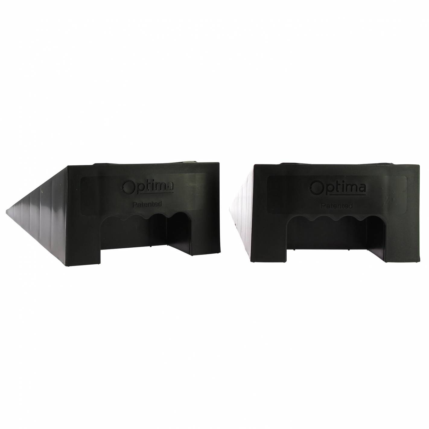 Cuñas Smart Level Optima para caravanas: juego de 2 cuñas de polietileno de alta densidad con tratamiento anti-UV, diseñadas para facilitar la nivelación en terrenos irregulares. Diseño con suave inclinación y buen agarre, carga máxima de 2000 kg por cuña, compatibles con las placas antideslizantes ref. 030250 y se suministran con bolsa de almacenamiento con bolsillos laterales.