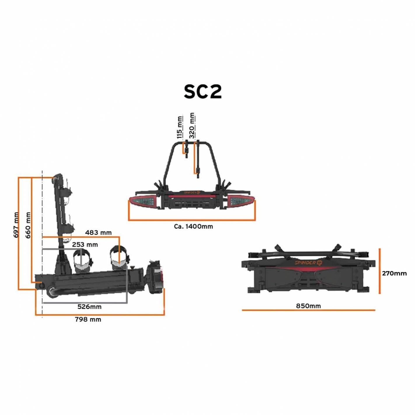 El portabicicletas SC2 de Premium Spinder es una solución elegante y funcional, capaz de transportar hasta dos bicicletas eléctricas (60 kg) y ampliable a tres con un raíl adicional. Su función deslizante permite acceder a las puertas traseras incluso cuando está cargado, mientras que su diseño plegable facilita su almacenamiento. Asegurado con brazos bloqueables y un sistema antirrobo, es fácil de instalar en la bola de remolque de cualquier vehículo.