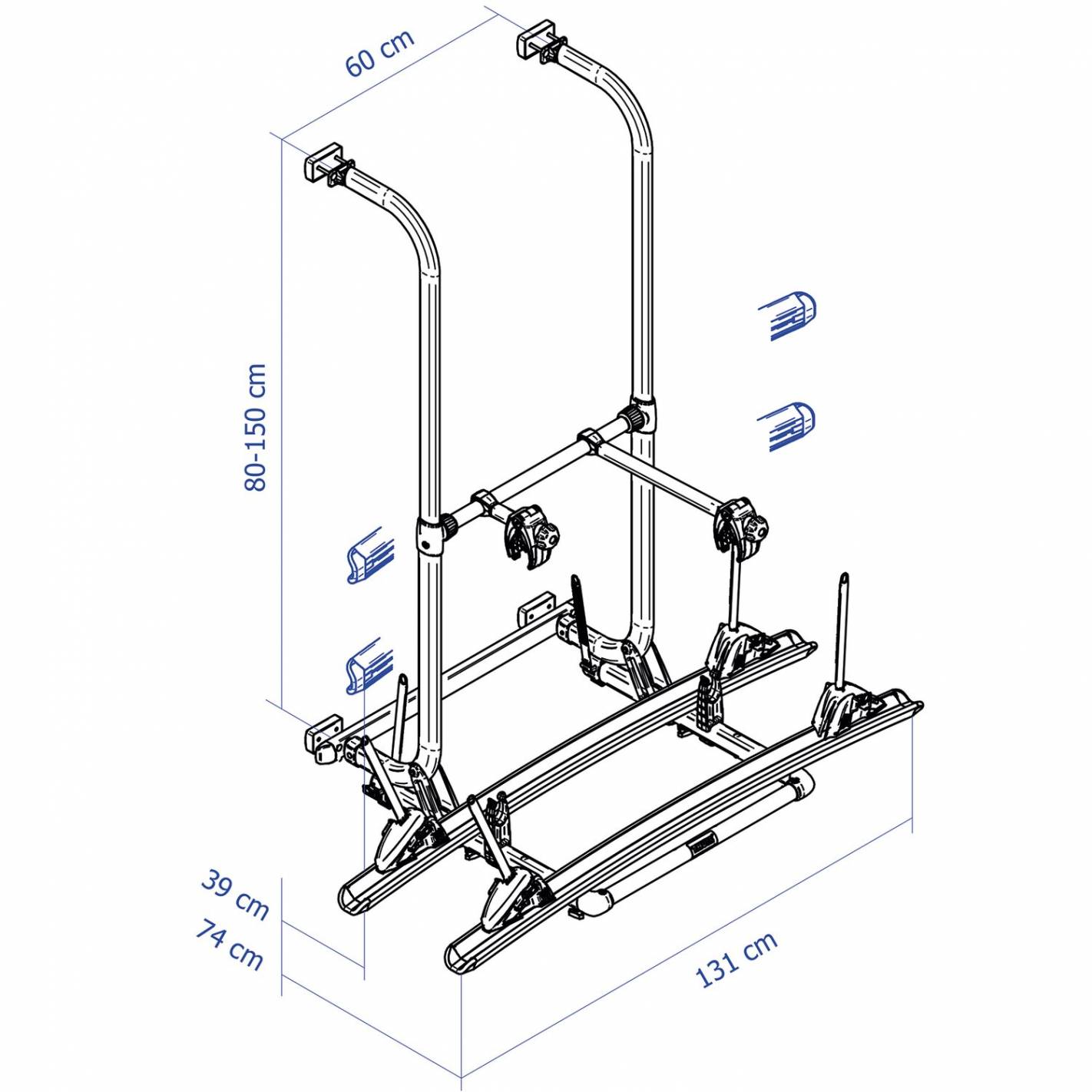 Este portabicicletas es regulable en altura gracias a sus tubos telescópicos de 80 a 150 cm. La anchura total es de 131 cm, la distancia entre ejes de fijación es de 60 cm y la profundidad es de 74 cm. Comprueba estos parámetros en tu vehículo antes de realizar la compra.