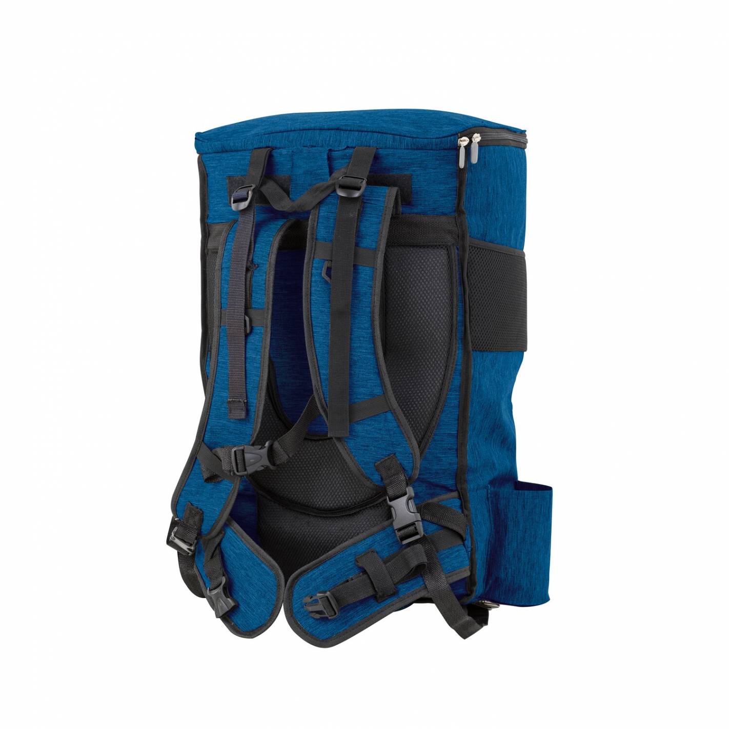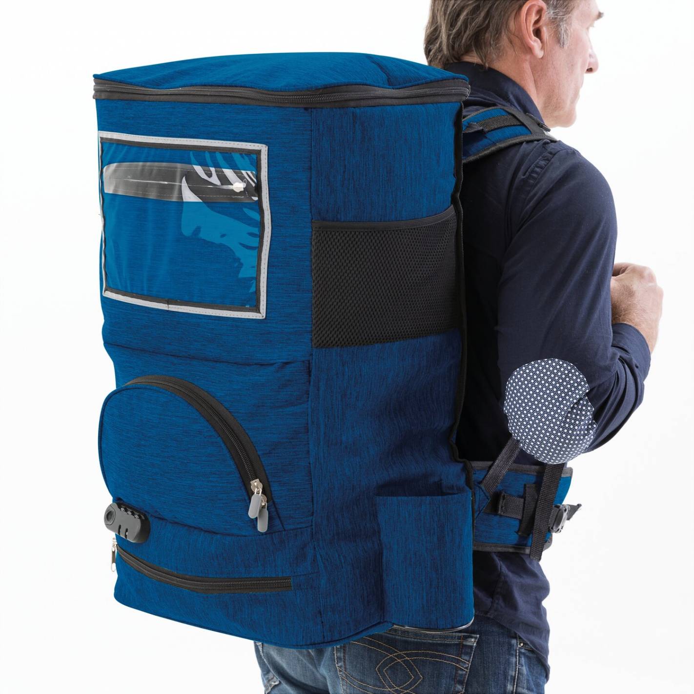 - Materiales: tejido de poliéster nylon azul vaquero, chasis de aluminio anodizado, ruedas con cámara de aire