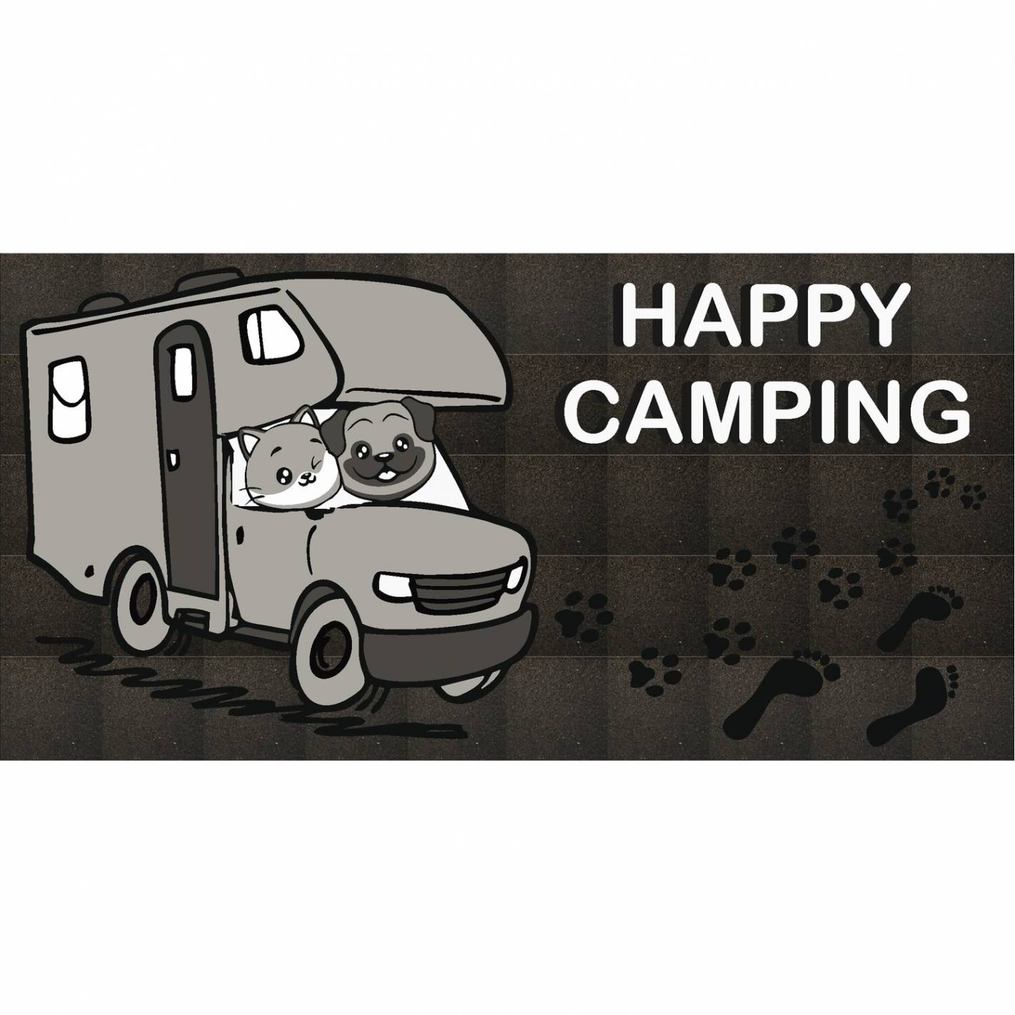 La alfombrilla para interior con diseño Happy Camping, fabricada en caucho reciclado, es perfecta para vehículos recreativos.