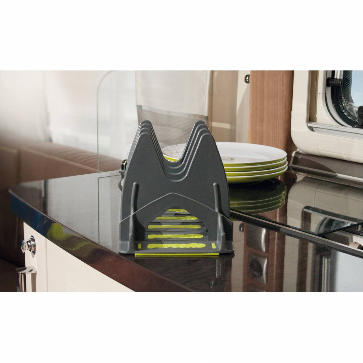 El escurreplatos puede utilizarse, como su nombre indica, para guardar platos, pero también como bandeja recogegotas. Es más, ¡no es sólo para platos! Puede utilizarse para todo tipo de vajilla: platos (de cualquier tamaño), fuentes, tablas de cortar, trébedes, etc... El soporte para platos es una práctica solución de almacenamiento en su vehículo de ocio (autocaravana, caravana, furgoneta, barco, etc.). Puede instalarlo sobre una encimera, en un armario o en un cajón.