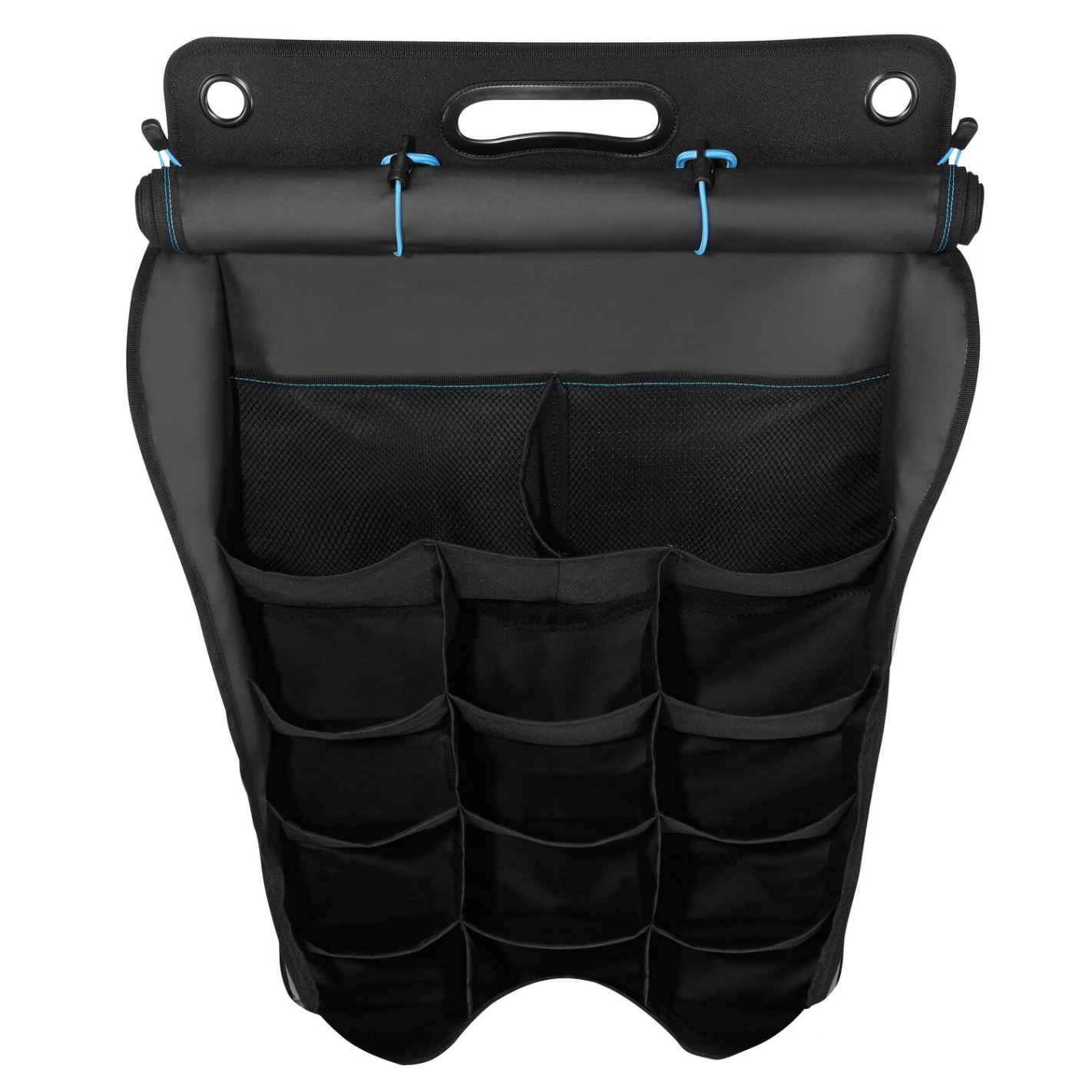 Con sus 16 bolsillos multiusos, este organizador te ofrece multitud de formas de organizar tus cosas de forma sencilla y eficaz. La tapa protege tus objetos de viaje. Los dos cordones elásticos de los laterales son ideales para colgar fácilmente un rollo de toallas de papel u otros objetos esenciales. Cuando no se utiliza, se pliega fácilmente para ahorrar espacio.