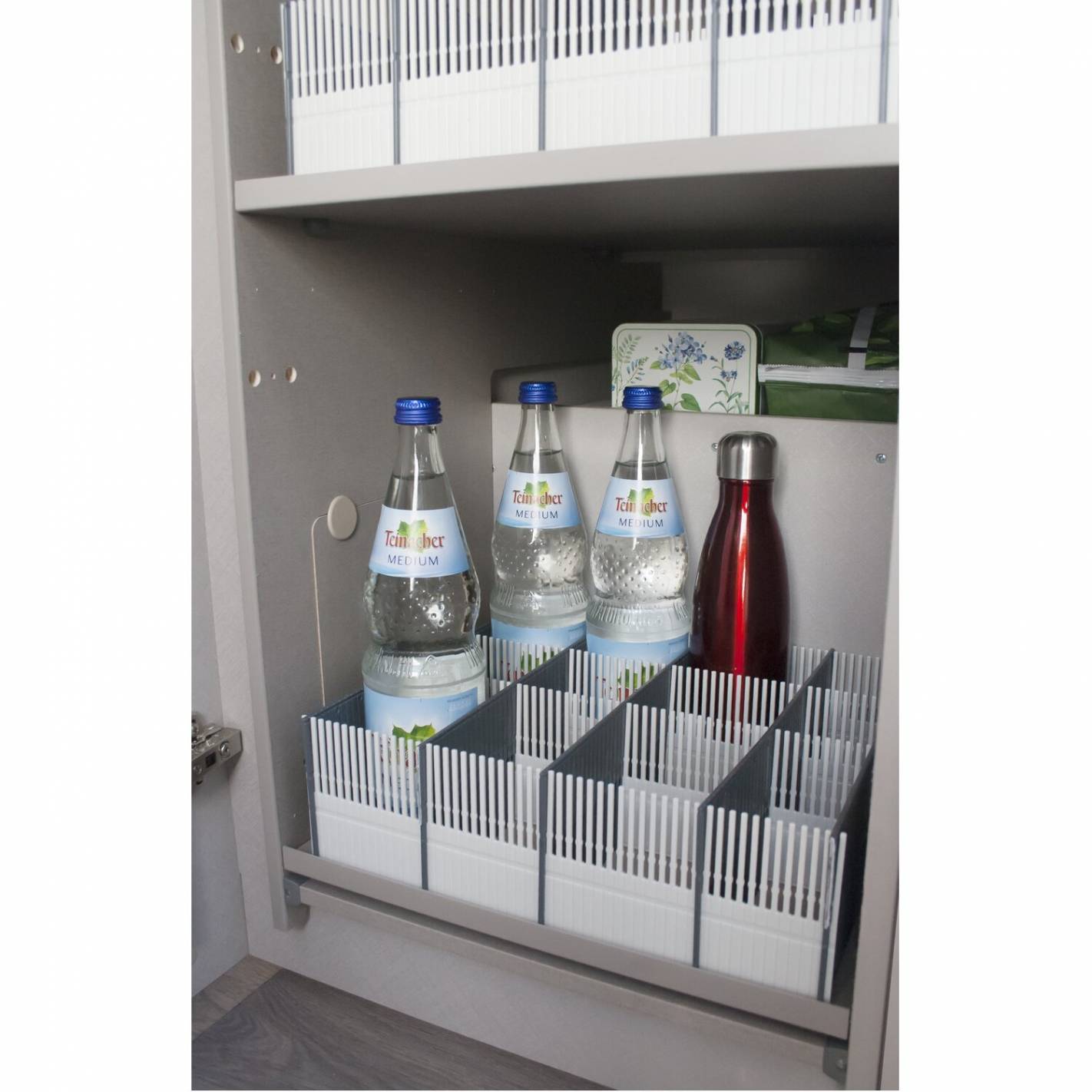 Organizador de cajones gris para transportar con seguridad vasos, botellas y latas. ¡Y sin ruido durante el viaje!