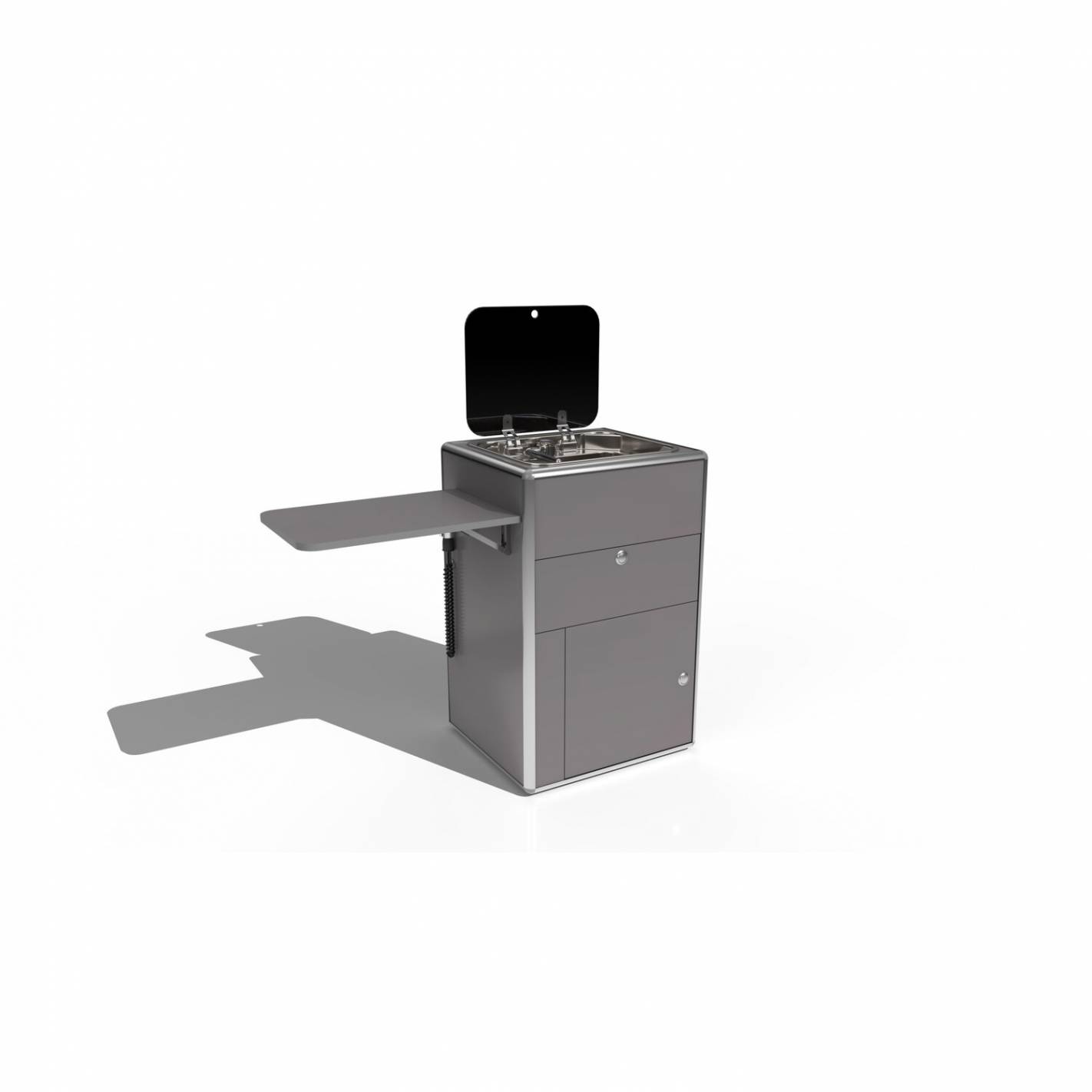 Esta solución desmontable y lista para usar está pensada para un uso práctico en furgonetas. Incluye un fregadero de acero inoxidable con tapa de cristal, un hornillo de un fuego (cartucho no incluido), una bandeja de trabajo lateral, dos bidones de 13 L y una bomba sumergible de 8 L/min.