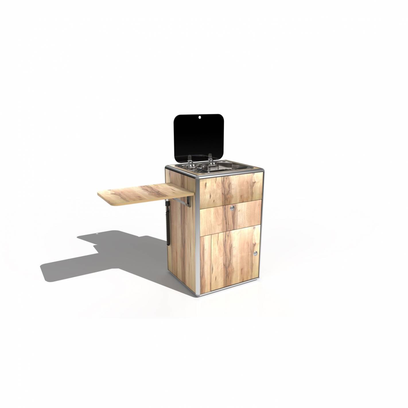 Esta solución desmontable y lista para usar incluye un fregadero de acero inoxidable con tapa de cristal, un hornillo de una hornilla (cartucho no incluido), una bandeja de trabajo lateral, dos bidones de 13 l y una bomba sumergible de 8 l/min. La conexión se realiza a través de una toma de mechero.