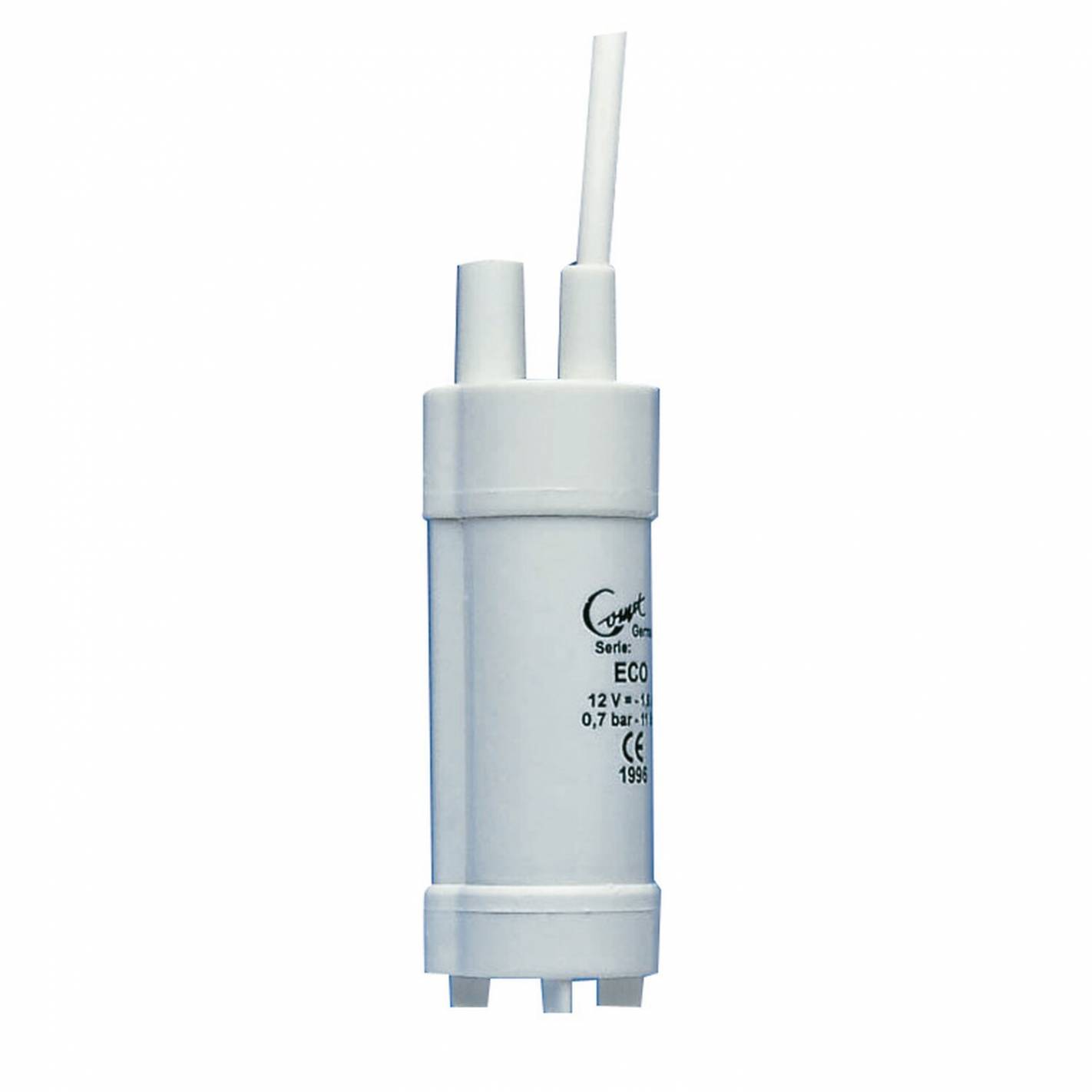 Caudal: 11 litros/minuto. No automático. Montaje con tubo de 10 mm. Consumo: 25 W/hora. Presión de agua: 0,7 bar. Tensión: 12 V. Dimensiones (L x Diám.): 120 x 38 mm.