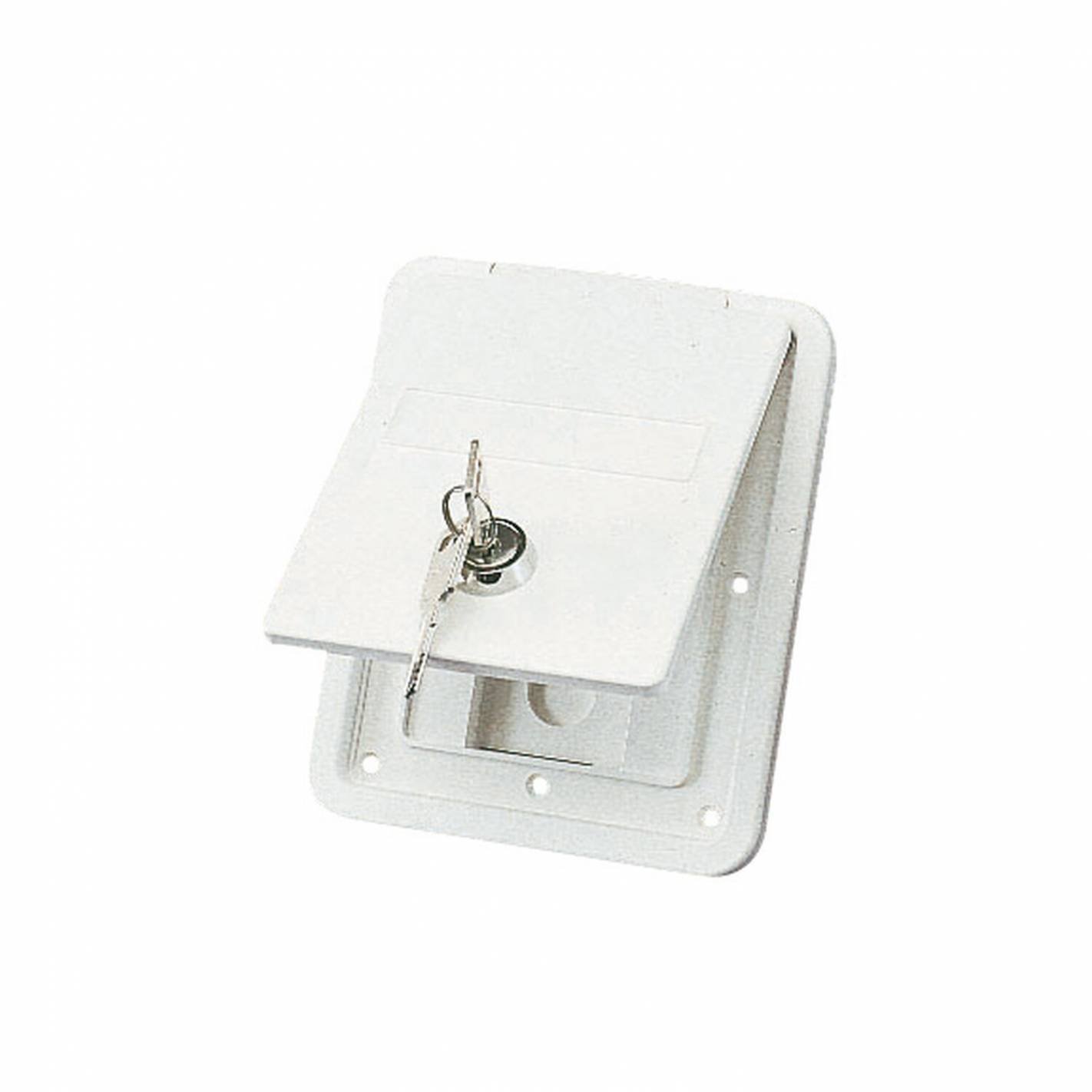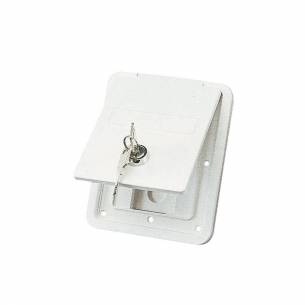 Taza con tapa accionada por llave. Puede instalarse vertical u horizontalmente.