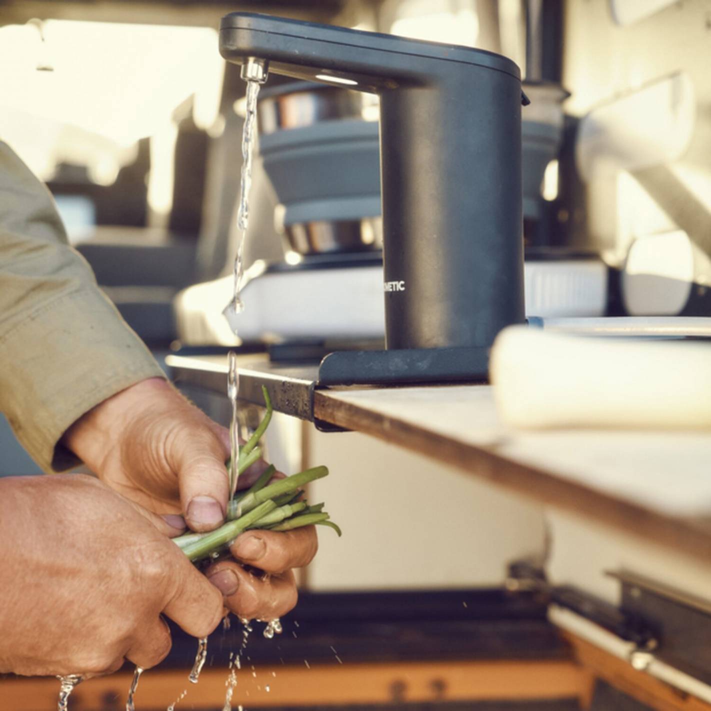 Nuestro grifo de hidratación te proporciona acceso instantáneo a agua corriente en todo momento. Tanto si estás llenando una botella de agua, preparando una comida o simplemente lavándote los dientes, basta con un simple gesto. Este sistema autónomo incluye una bomba autocebante y una manguera, alimentadas por una batería recargable capaz de dispensar hasta 150 litros de agua por carga.