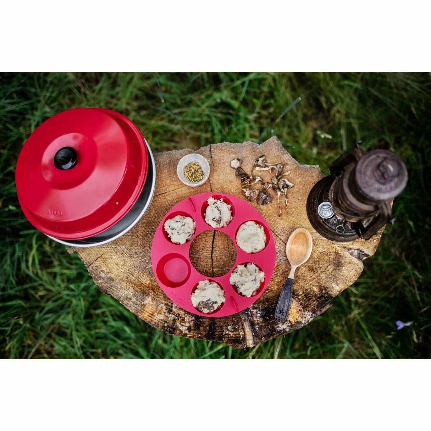 Si desea hacer preparaciones más grandes, como una quiche o una tarta, puede utilizar el molde de silicona para horno de camping Omnia.