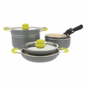 Consta de 8 piezas: 1 olla de 4 litros de 20 cm de diámetro, 1 olla de 20 cm de diámetro, 1 cacerola de 14 cm de diámetro, 1 cacerola de 18 cm de diámetro, 1 sartén de 18 cm de diámetro, 1 tapa de 18 cm de diámetro, 1 tapa de 20 cm de diámetro con colador incorporado y 1 asa extraíble.