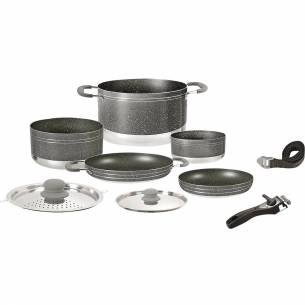 Consta de 8 piezas: 1 olla de 4 litros de 20 cm de diám., 1 cazuela de 18 cm de diám., 1 cazuela de 14 cm de diám., 1 cacerola de 20 cm de diám., 1 sartén de 18 cm de diám., 1 tapa con colador integrado de 20 cm de diám., 1 tapa de 18 cm de diám. y 1 asa desmontable.