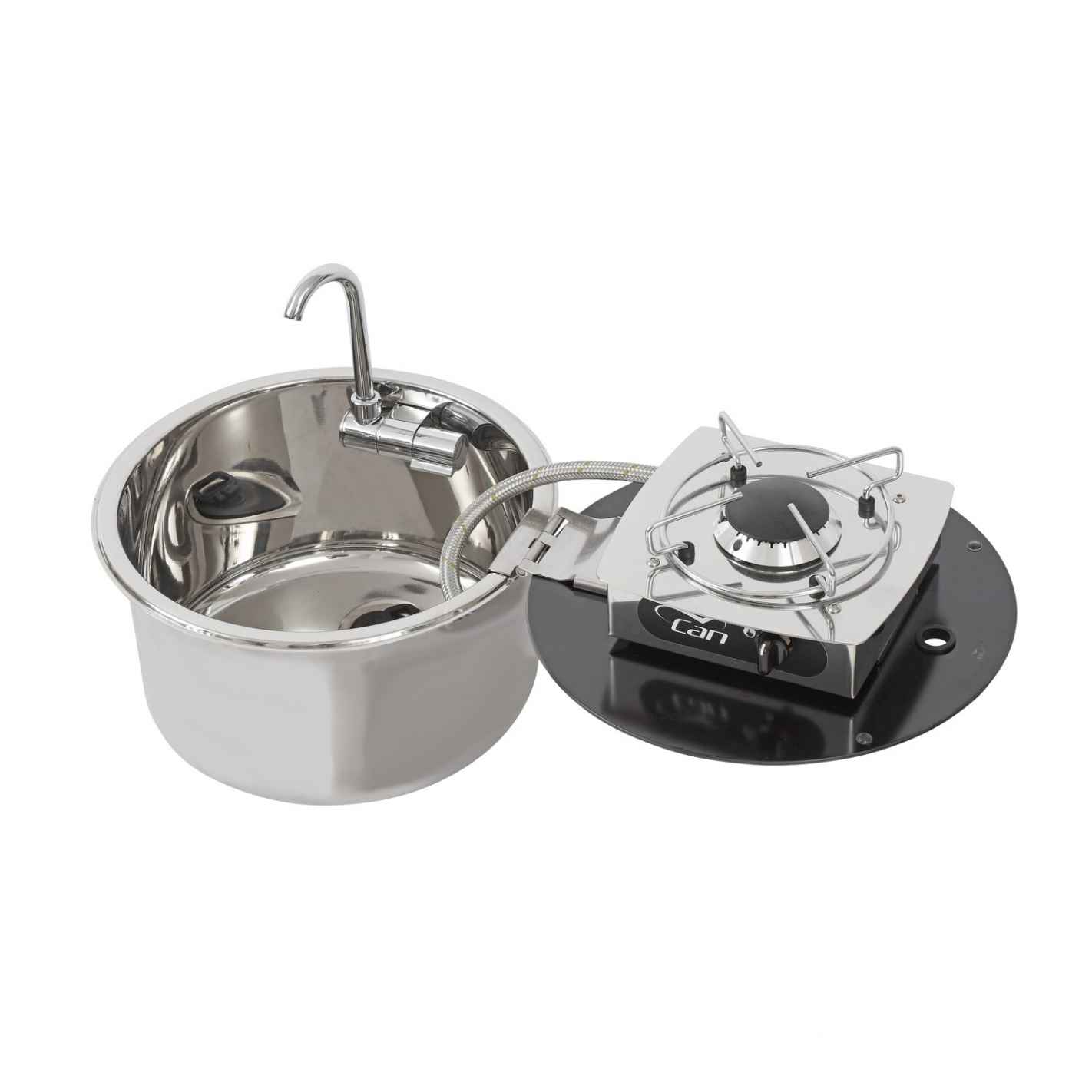 Cocina de acero inoxidable con quemador equipado con termopar: potencia de 1750 W. Se entrega con grifo de agua fría, espacio para sujetar ollas y tapa integrada de vidrio templado ahumado ultrarresistente. El desagüe no se incluye con el fregadero. Profundidad del fregadero: 18 cm. Peso: 6 kg. Dos modelos disponibles. Fregadero rectangular de 350 x 320 mm y 180 mm de profundidad