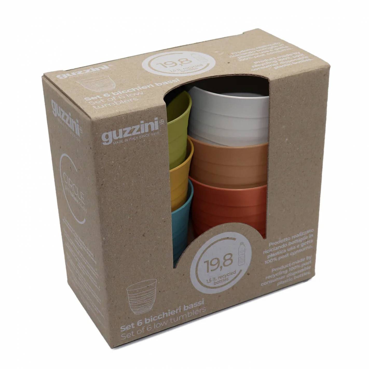 El lote de 6 vasos  Guzzini combina un diseño colorido con un compromiso ecológico. Fabricados con plástico 100 % reciclado procedente de botellas, son ligeros y resistentes a los golpes. Ideales para ir de camping o para la vida en furgoneta, son apilables para facilitar su almacenamiento.