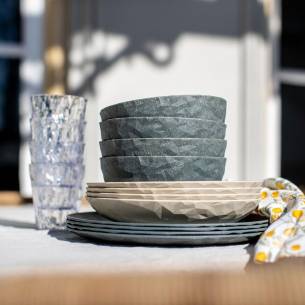 Los platos llanos, hondos y boles están fabricados con materiales naturales (termoplástico y fibra de madera). Los termoplásticos están hechos de aceite de colza, aceite de girasol y madera (procedente de bosques con certificado FSC®). La vajilla no contiene melamina ni BPA.