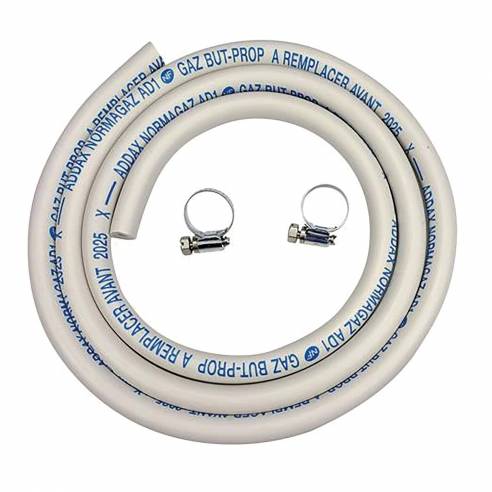 Kit de conexión de gas NF con tubo flexible. Esta lira flexible se utiliza para conectar electrodomésticos de camping como barbacoas, hornillos, planchas, etc. a una bombona de gas. La conexión se realiza mediante 2 abrazaderas de seguridad (incluidas).