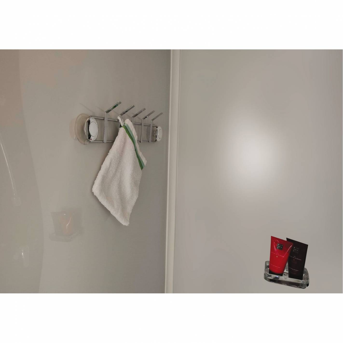 La estantería tiene forma de repisa con 5 ganchos. Puede instalarlo en un cuarto de baño o ducha para colgar accesorios de baño (guantes, toallas, flores de ducha, etc.). También puede utilizarse como toallero.