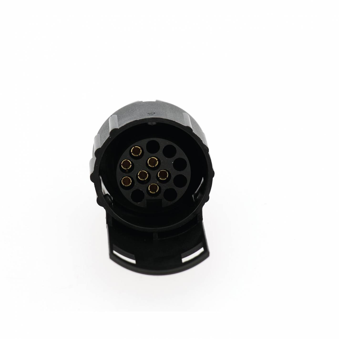 Adaptador 7 polos macho  /  13 polos hembra. Permite conectar el mazo de cables eléctricos del coche y de la caravana (o remolque)