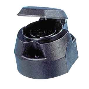Toma  /  base hembra de 13 polos para conexión del coche o caravana. Tensión 12 voltios. Este accesorio eléctrico se ha diseñado especialmente para garantizar la conexión eléctrica entre su vehículo (coche, SUV, furgoneta) y su caravana. La base de 13 clavijas incluye las conexiones: 1. Intermitente izquierdo, 2. Luz antiniebla, 3 Puesta a tierra para contacto de 1 a 8, 4. Intermitente derecho, 5. Iluminación trasera derecha, 6. Luz de freno, 7. Iluminación trasera izquierda, 8. Luz de marcha atrás, 9. Permanente, 10. Recarga de la batería auxiliar, 11. Sin conexión, 12. Sin conexión, 13. Puesta a tierra para contactos de 9 a 12.