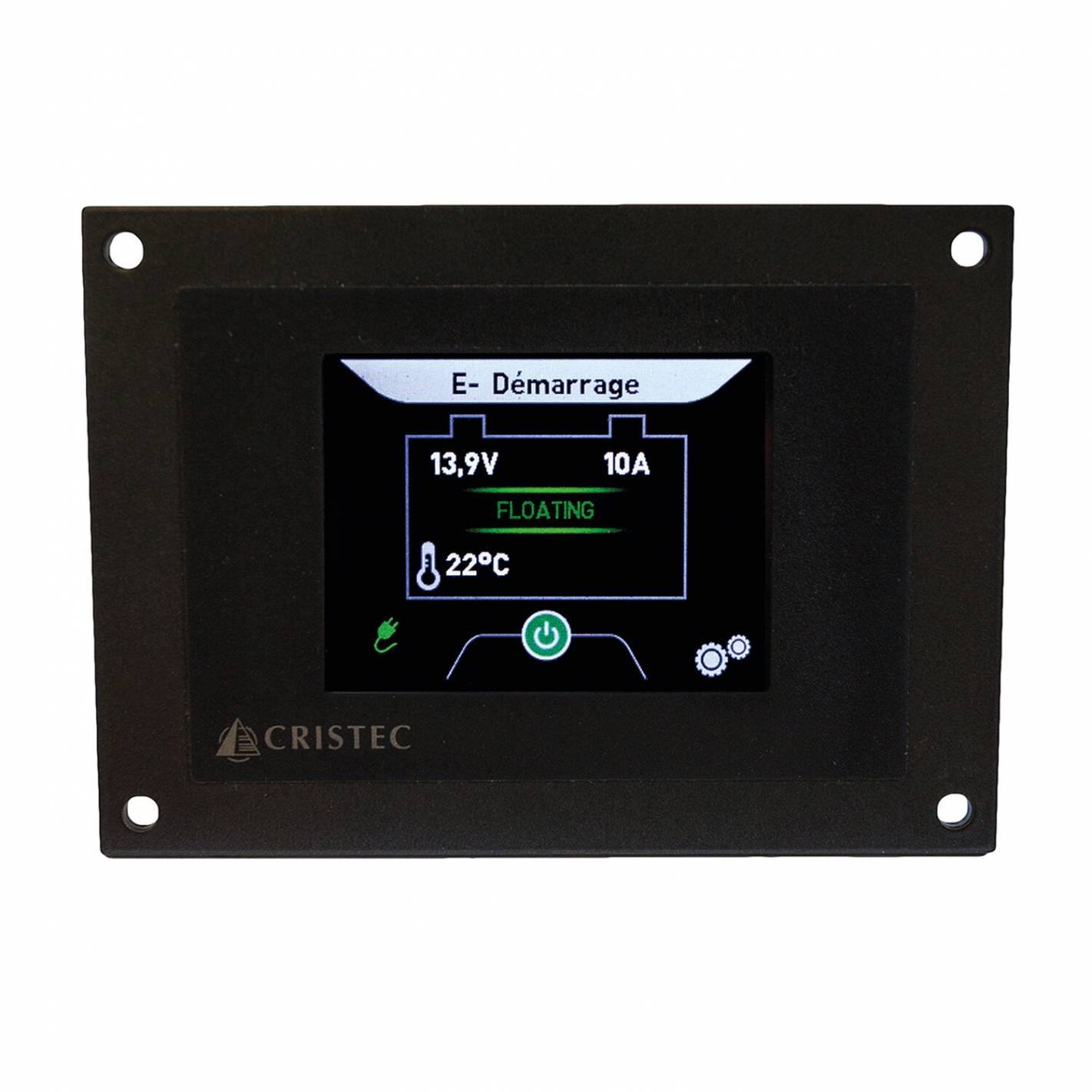 Pantalla táctil de 3,5 pulgadas de alta resolución y bajo consumo de energía. Dimensiones: L 105 x A 105 x P 40 mm. Corte: 88 x 88 mm. Tensión nominal de batería ajustable (12 V/24 V/48 V en marcha). Adecuado para una potencia máxima de 3600 W/12 V o 7200 W/24 V. Dimensiones de la derivación: L 119 x A 44 x P 43 mm. Conexión: diámetro M8.