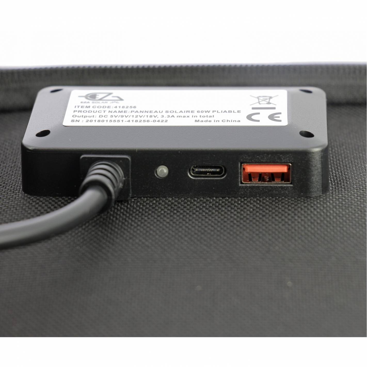 El panel solar plegable de 100 W o 60 W recarga tus dispositivos y tu batería auxiliar a través de las siguientes conexiones: