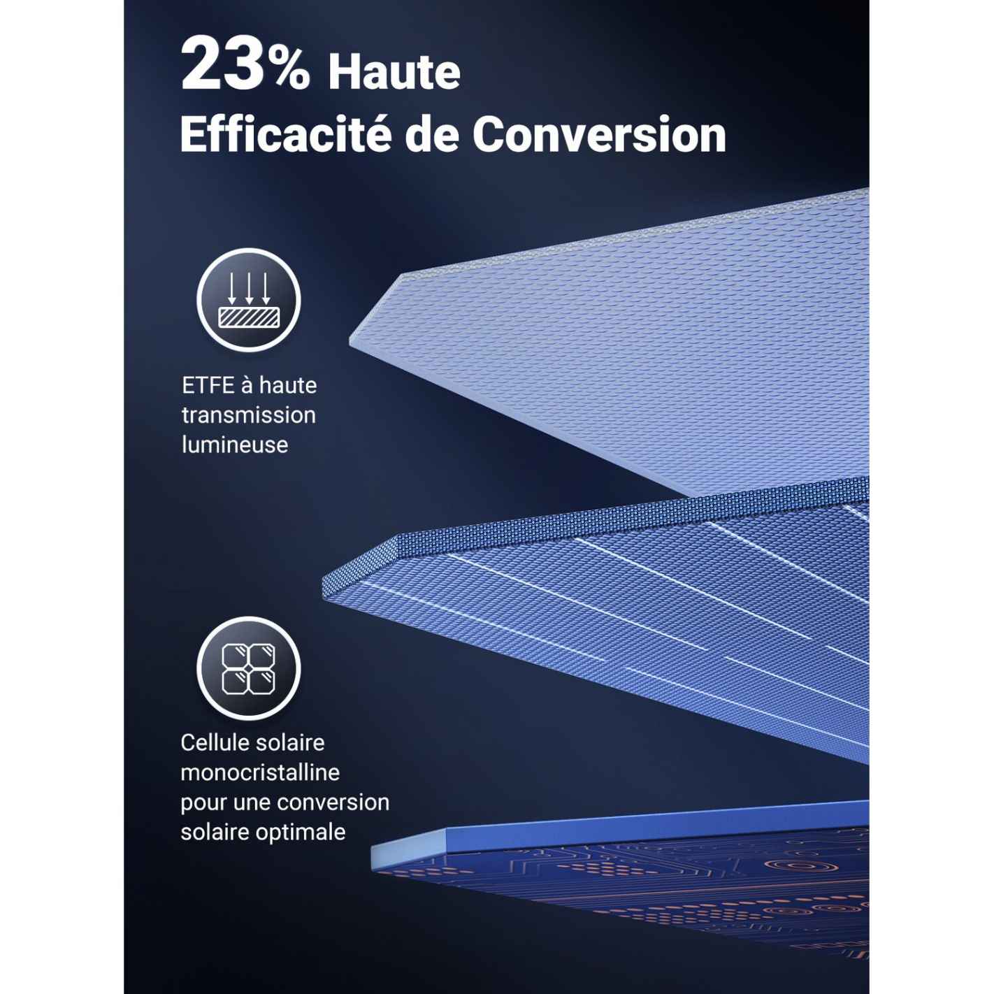- Máxima eficiencia: con un rendimiento de conversión de hasta el 23 %, capta la máxima energía, incluso con cielo nublado.