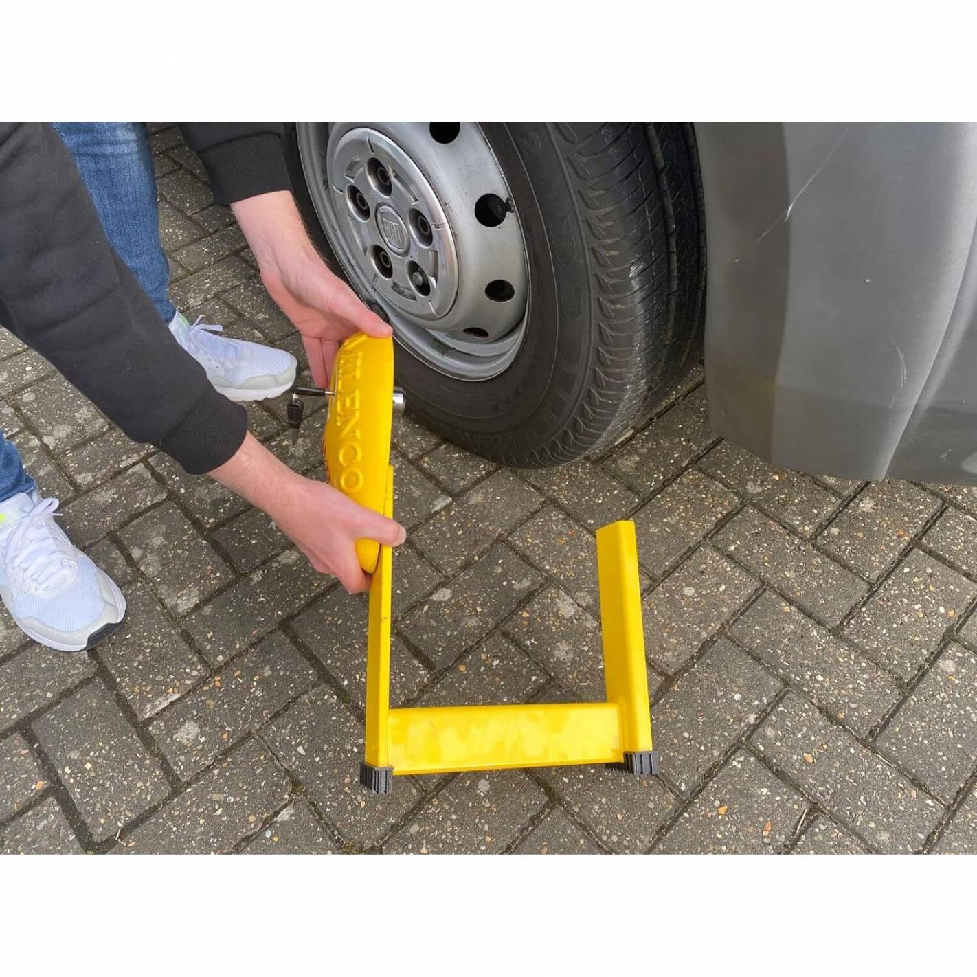 El sabot se fija firmemente a una tuerca de rueda específica incluida con el antirrobo, envolviendo la rueda para bloquear su rotación. Su gran visibilidad lo convierte en un elemento disuasorio muy eficaz, lo que lo convierte en una medida eficaz para prevenir el robo.