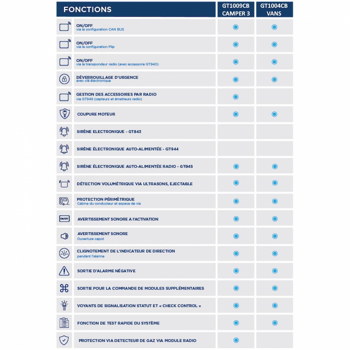 El GT1009CB es un completo sistema de alarma diseñado para proteger eficazmente la célula, la cabina, las puertas, las ventanas, los cofres y las lunas de tu vehículo recreativo.