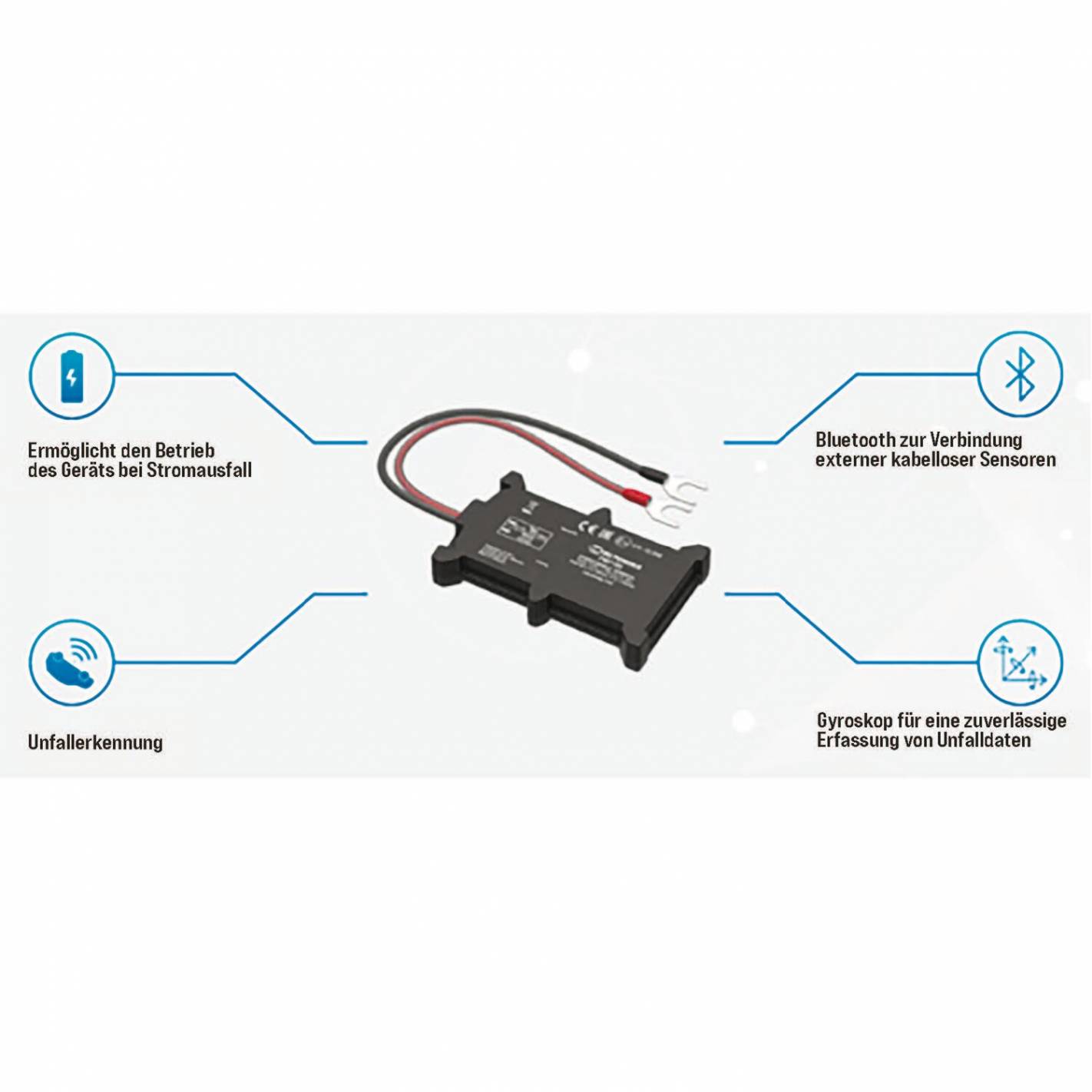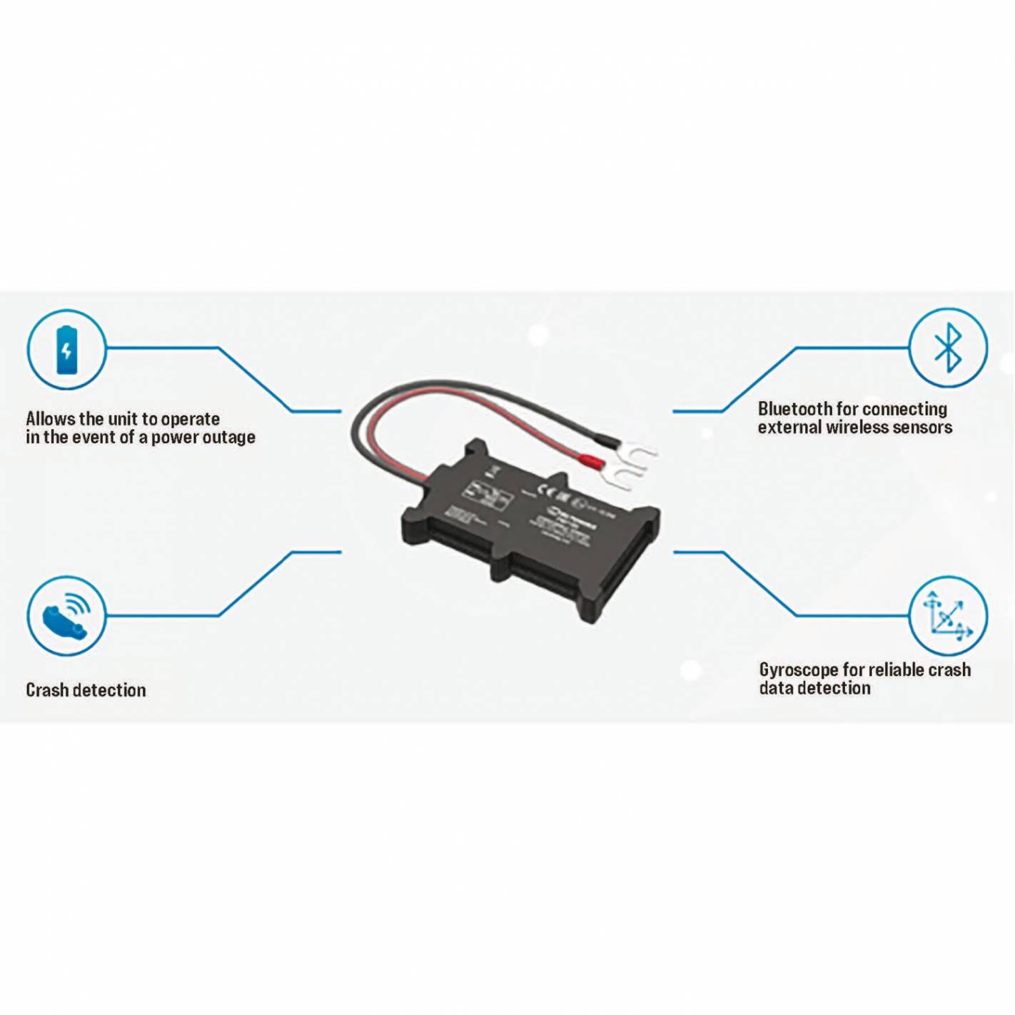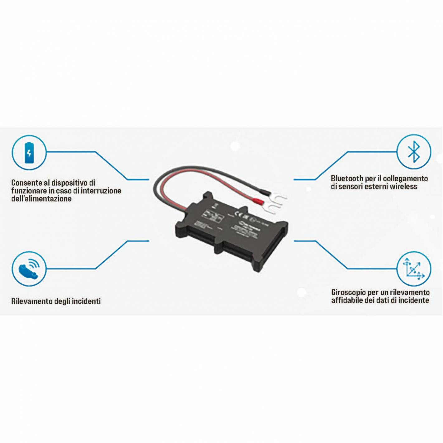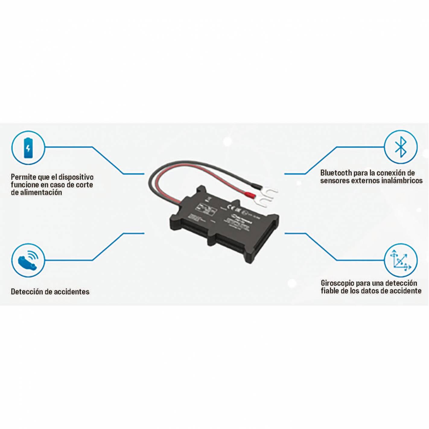 Se acopla a la batería del vehículo, es impermeable y dispone de conexión Bluetooth para su uso a distancia. Incluso dispone de una batería interna de reserva. Además, con un acelerómetro y sensores giroscópicos integrados, dispone de una función de detección de colisiones. Así que este rastreador es ideal para soluciones en el mercado de los seguros.