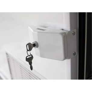 Fabricada en aluminio anodizado resistente con lacado blanco, la cerradura se abre y se cierra con un movimiento lateral. Es mucho más resistente que un cierre giratorio.