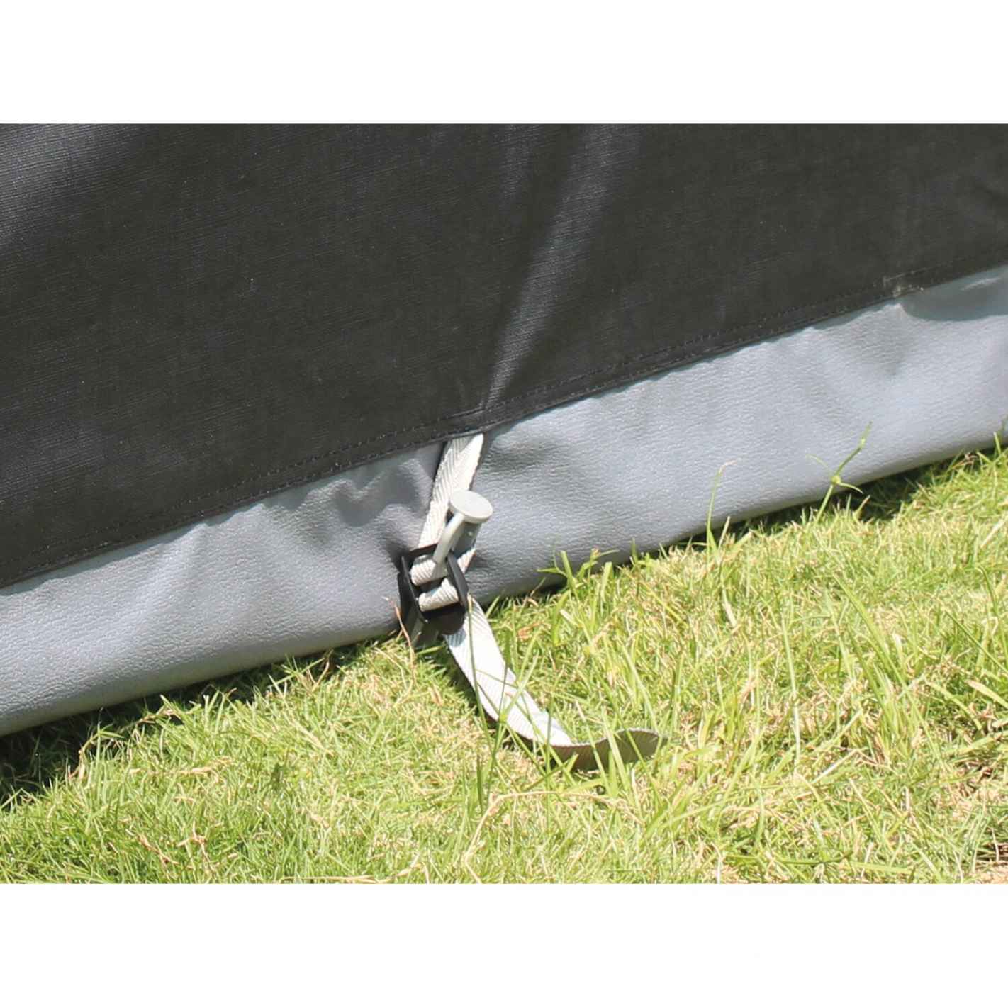 El avance es muy fácil de montar gracias a su tejido ligero y a su armazón (25 mm de diámetro) con ganchos amortiguadores y palancas de cierre rápido easyFix SummerLine, así como esquinas articuladas de acero. Se suministran todos los accesorios de fijación (estacas y cintas elásticas). También se incluyen 4 cuerdas tensoras para tormentas en la parte delantera, 2 en cada lado y un ojal para correa de viento en cada lado. Después de su estancia, podrá guardarla fácilmente en sus bolsas de transporte. ¡Ingenioso!