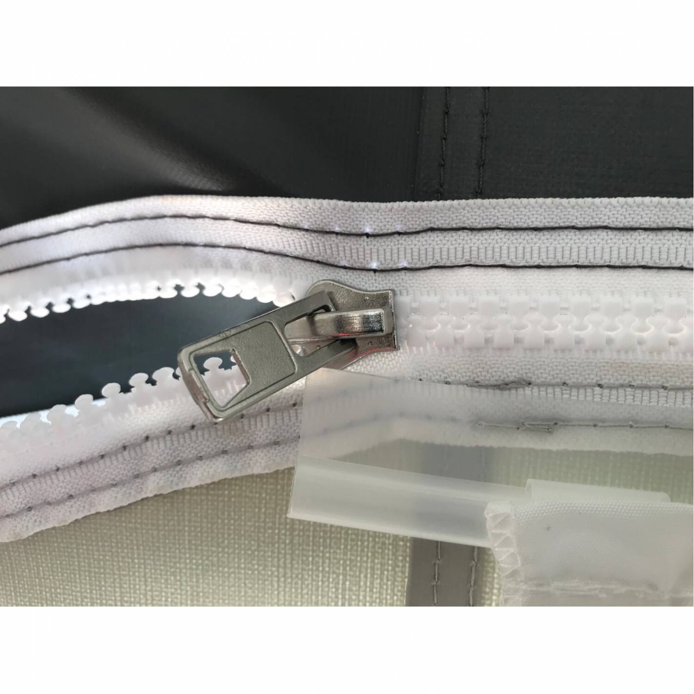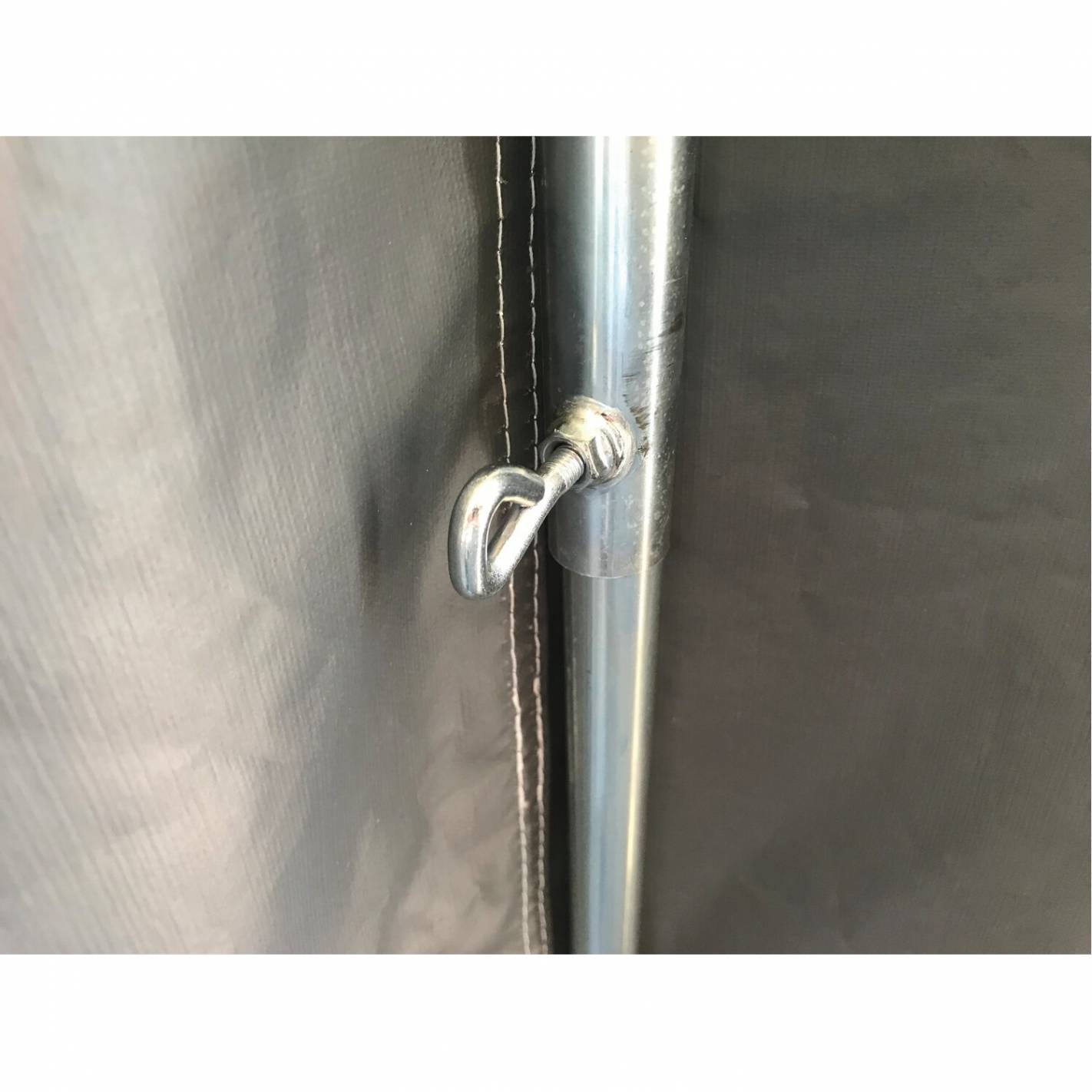 La lona del avance para las paredes y la fachada es una lona de PVC (350 g/m2) impermeable y resistente. Además, el techo es de poliéster recubierto (270 g/m2) para una mayor resistencia (por ejemplo, bajo los árboles). La estructura es de acero (diámetro de 25 mm), con ventosas, para garantizar una buena sujeción del avance tradicional.