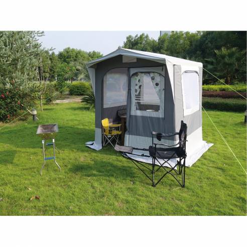Refugio exterior especial camping Eden de Summerline. Refugio exterior con capota de techo saliente para proteger la abertura frontal. Ideal para disfrutar de una habitación complementario en el camping: cocina, almacenamiento, habitación, aseo... Lo podrá utilizar para lo que desee junto con su autocaravana, caravana o furgoneta equipada. Apertura y cierre completo en la parte frontal mediante cremallera. Ambos laterales y la parte trasera están equipados con ventanas grandes con mosquiteras y oscurecedores. Las paredes son de poliéster transpirable. El tejido susceptible de deteriorarse (también llamado faldillas o faldas), las correas y el techo se han fabricado en PVC de doble cara. De esta forma, el conjunto es una estructura sólida, resistente y muy aireada. Altura de 195/215 cm. Dimensiones (LxP): 200 x 150  cm. Peso: 12,9  kg.