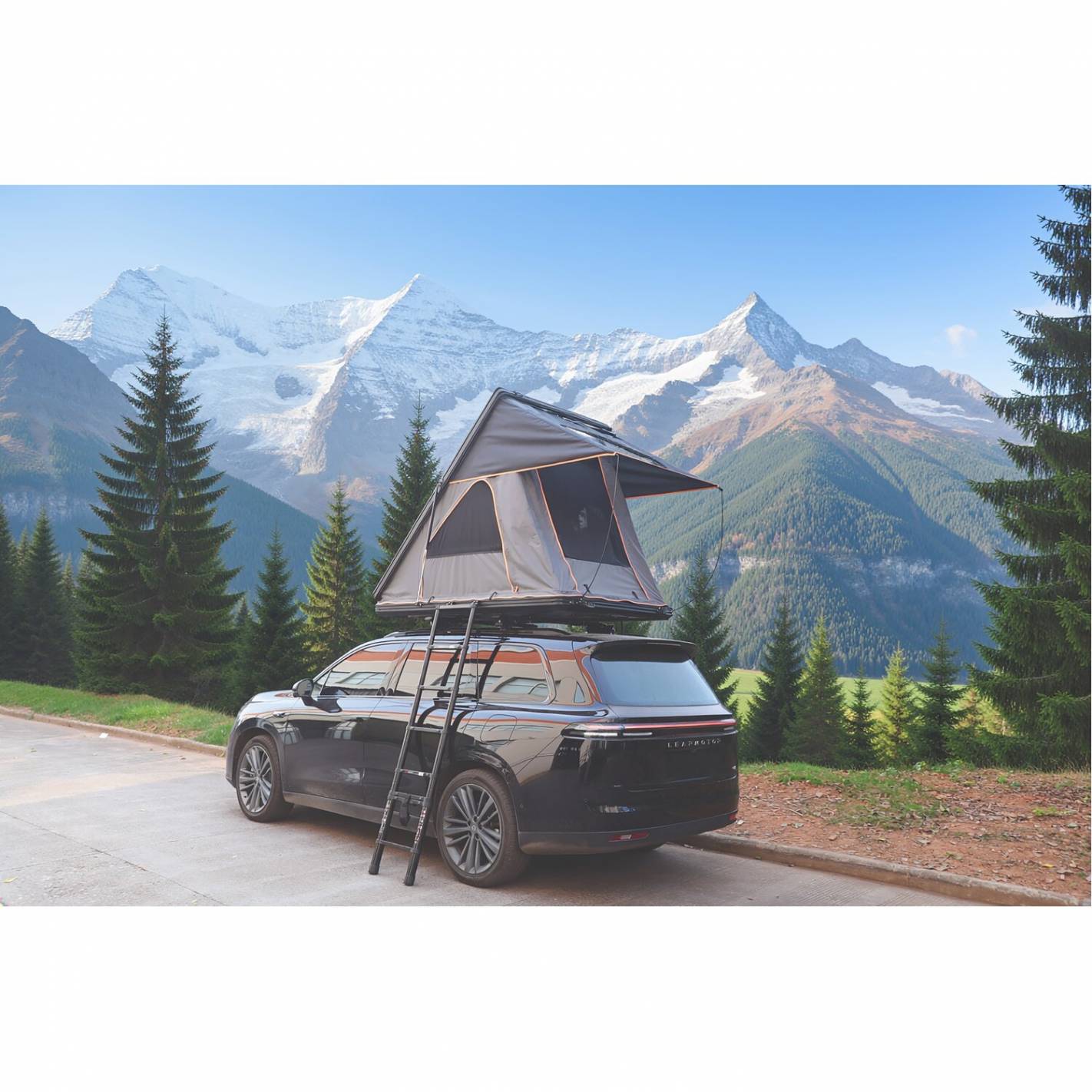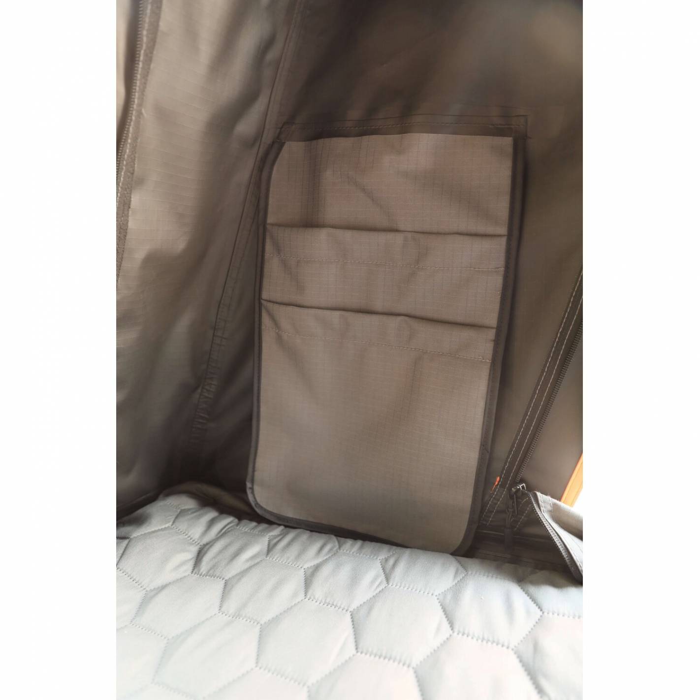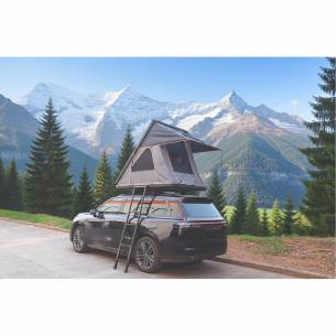 Tienda de techo rígida Soplair Rainbow para 2 adultos, con estructura de aluminio negro y lona de polialgodón gris de 320 g/m² (PU 3000 mm) + protección contra la lluvia integrada (PU 10 000 mm). Superficie para dormir de 121 × 201 cm con colchón de espuma y funda extraíble, apertura semiautomática (2 cilindros, 4 bisagras), 21,5 cm cerrada y 170 cm abierta. Equipada con puertas y ventanas con contraventanas/mosquiteras, avance con ventana de cristal, escalera de aluminio de 2,3 m con bolsa, compartimentos de almacenamiento y lámpara incluida.