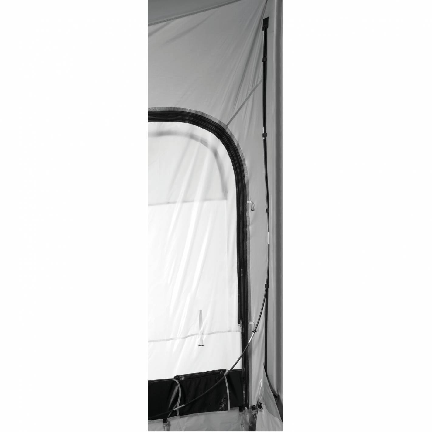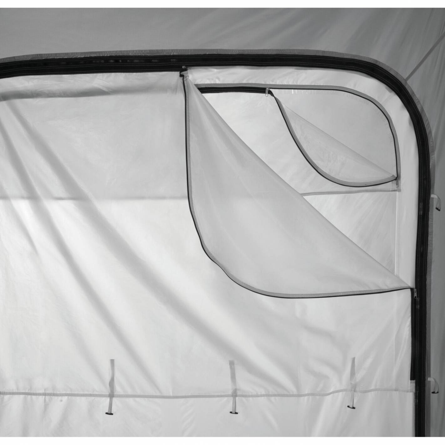 El montaje del avance es muy sencillo y rápido. ¡En solo 20 minutos tendrás tu espacio exterior! El avance está diseñado en una sola pieza y no necesita perfiles. Además, no tiene armazón. Se desliza fácilmente en el riel de la caravana o en el riel situado debajo de la caja del toldo (se fija sin dificultad en el riel delantero del toldo). Los accesorios de fijación están incluidos: piquetas y tensores.
