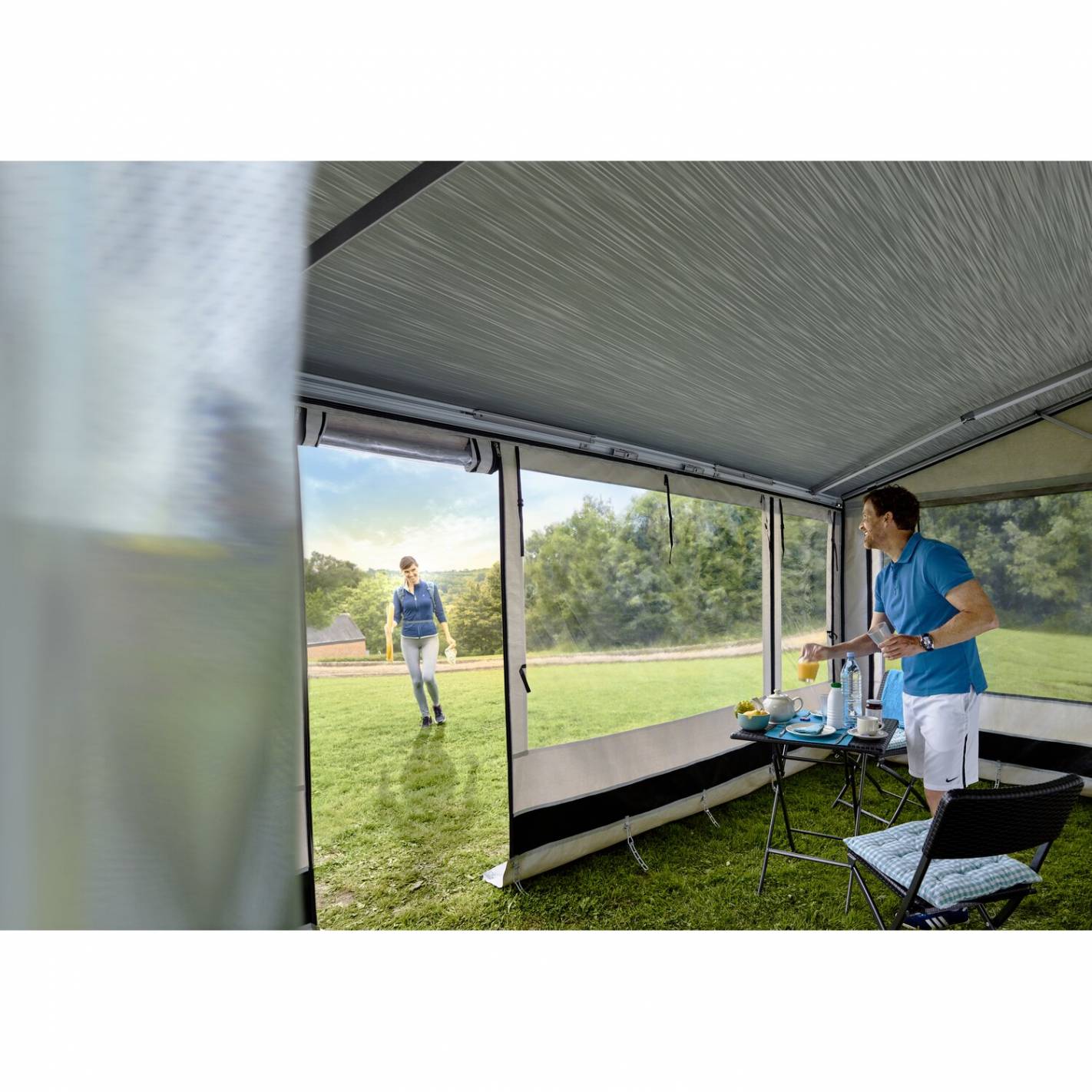 La puerta de entrada se coloca a la derecha o a la izquierda en la parte delantera. El toldo tiene ventilaciones en cada lado para garantizar una perfecta circulación del aire cuando está cerrado. Además, las 2 ventanas laterales están equipadas con mosquiteras.