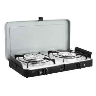 Ligero y con funcionamiento mediante botella de gas (no incluida), este hornillo de dos fuegos con encendido piezoeléctrico ofrece seguridad y estabilidad gracias a sus patas antideslizantes.