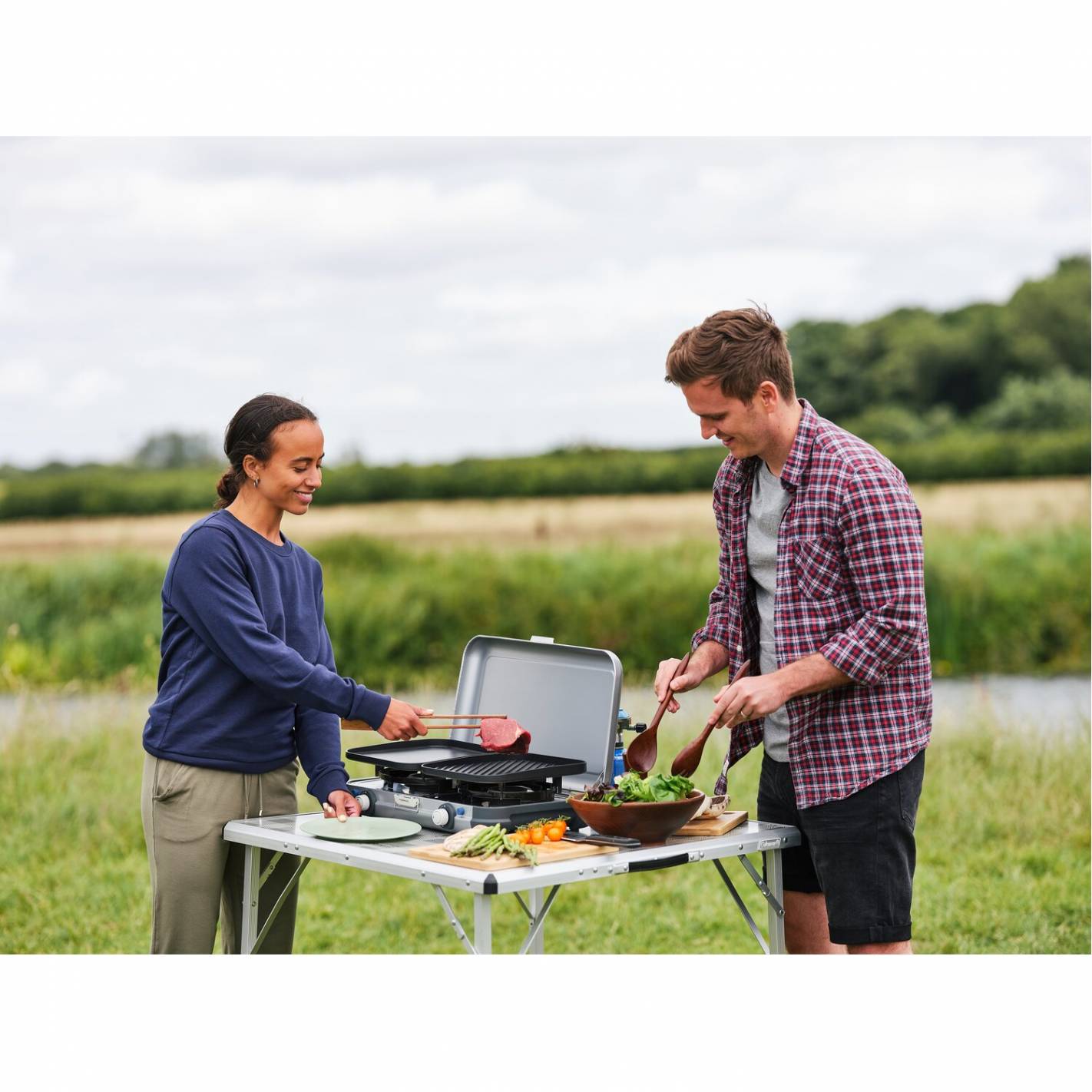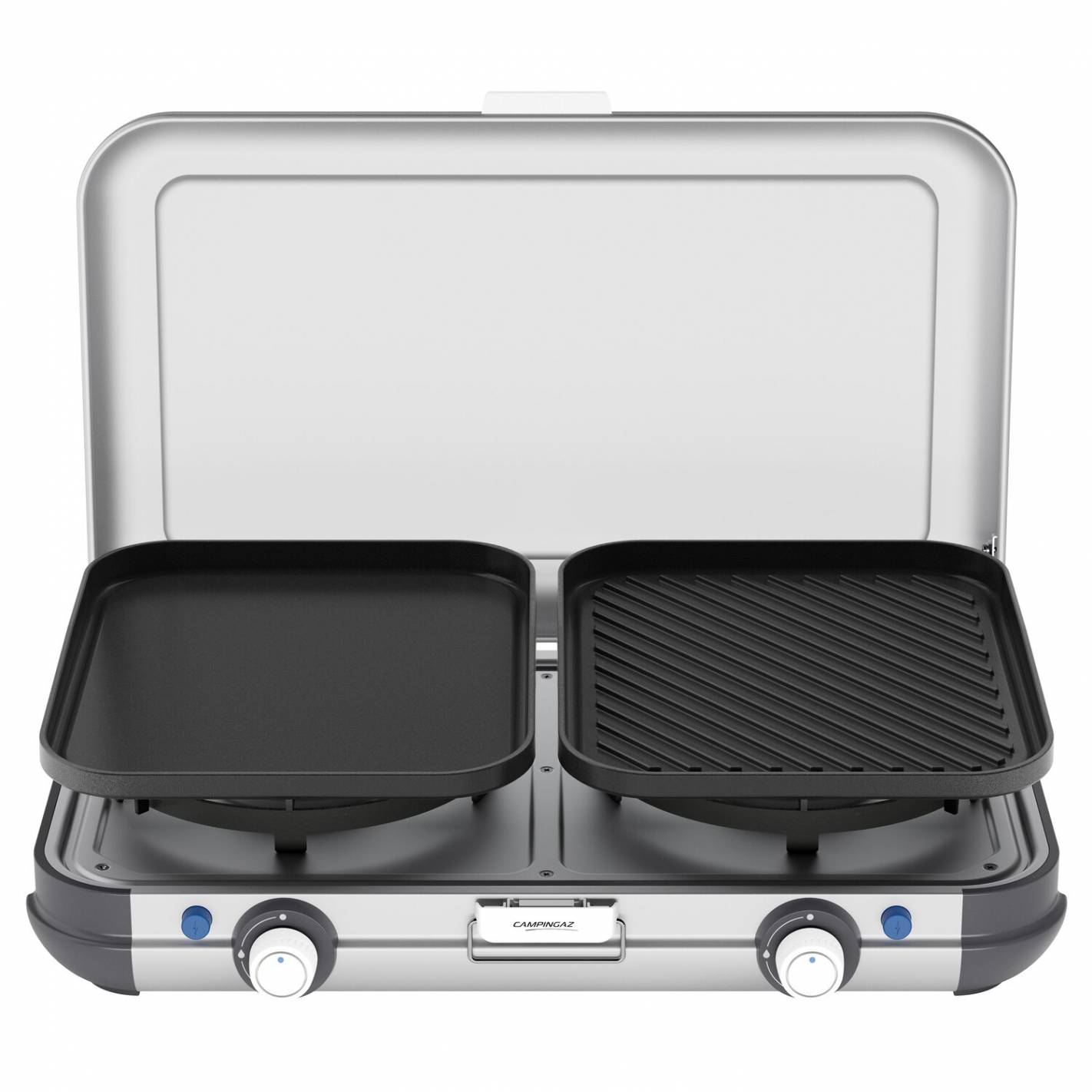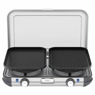 El hornillo de gas de 2 fuegos Campingaz Grill & Go CV Kit es el aliado perfecto para los viajeros y campistas que desean cocinar fácilmente, estén donde estén. Compacto y versátil, combina rendimiento, modularidad y confort de uso. Sus placas intercambiables permiten variar los placeres: parrilla para carnes y verduras, plancha para cocciones homogéneas o soportes para cacerolas para un uso clásico.