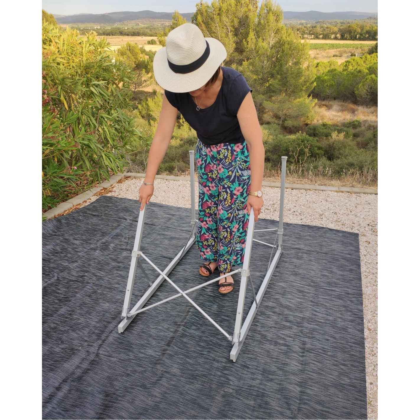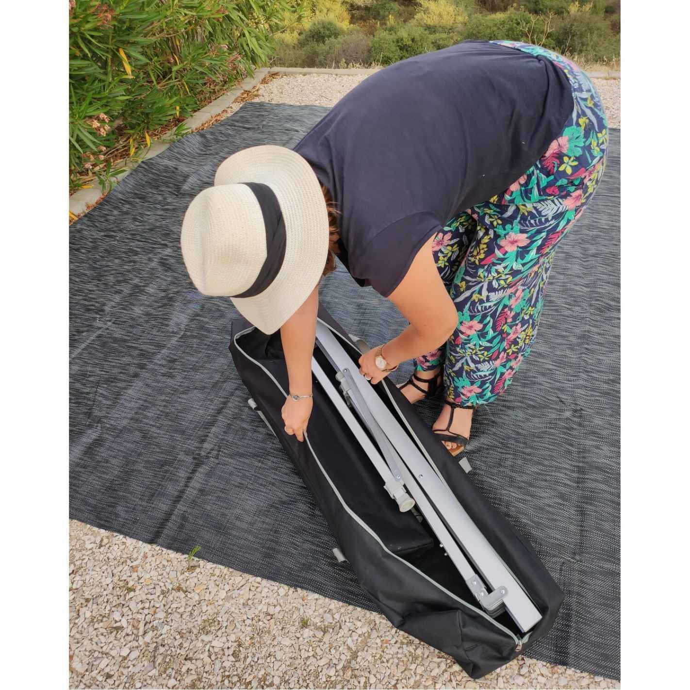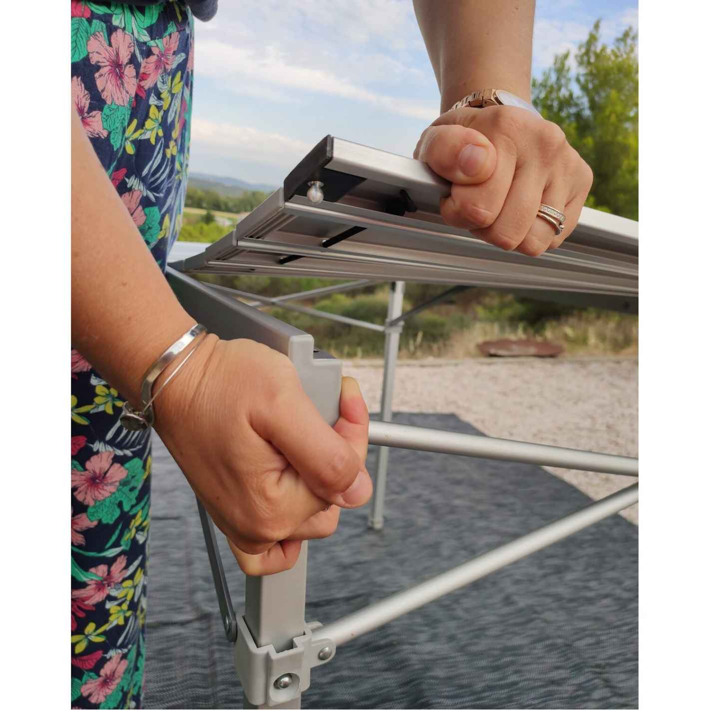 La mesa de camping Soplair se puede utilizar en exteriores para la actividad que elijas: picnic, comidas, aperitivos, juegos de mesa, descansos, etc. Fácil de transportar en su bolsa, puedes llevarla contigo a todas partes en tu furgoneta, caravana, barco... o guardarla en tu caseta de jardín junto con el resto de accesorios de mobiliario.