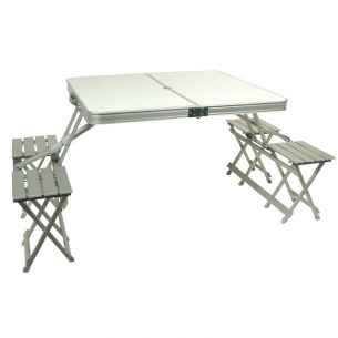 Se adapta perfectamente a 4 personas gracias a sus 4 asientos integrados directamente en la mesa. Además, la mesa maleta se compone de una bandeja, 4 asientos y tubos que conectan el conjunto. Esta estructura está hecha de aluminio para garantizar la resistencia, la estabilidad y la ligereza al mismo tiempo.