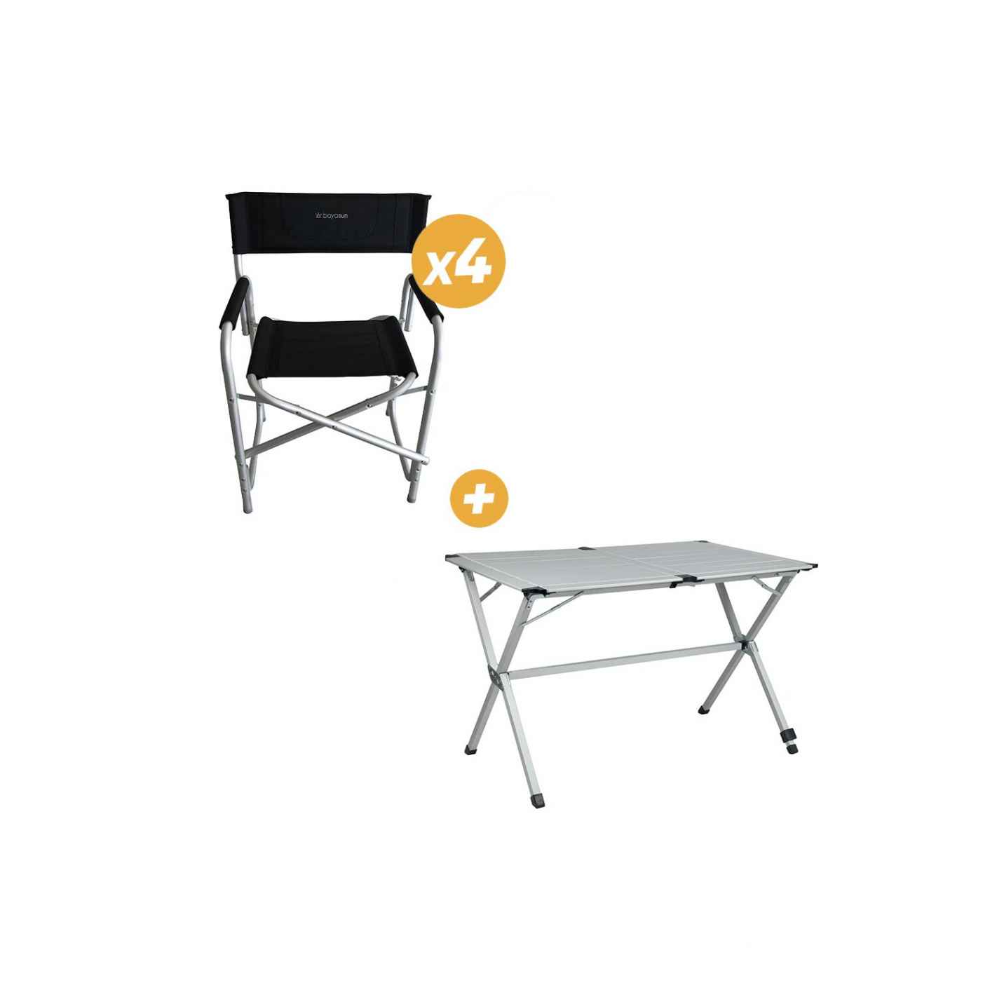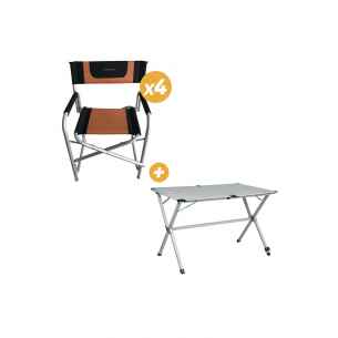 El pack incluye 4 sillones Director (RG-1Q21447) y una mesa de camping plegable Gap Less (RG-1Q1107C3). Según el modelo y el color que elija, obtendrá 4 sillones negros o negro-naranja con una mesa para 4 ó 6 personas.