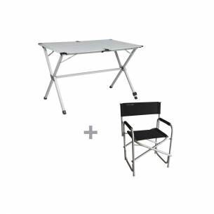 Pack Relax de mesa y sillas de camping para 4 personas: 1 mesa plegable Gapless + 4 sillas Director de aluminio. Una verdadera mesa de camping, fácil de montar y de desmontar, muy compacta con su tablero de láminas de aluminio enrollables, ligera y resistente gracias a su estructura de aluminio, regulable gracias a un pie de altura ajustable que permitirá compensar las irregularidades del terreno y fácilmente transportable gracias a su bolsa de almacenamiento. Junto con sillas de camping para los campistas y para un uso recreativo, será el compañero ideal de sus escapadas y de sus salidas de camping. Gran resistencia para un uso intensivo de cara a los inconvenientes del aire libre: suciedades, UV, intemperie... compactas, ligeras y fáciles de transportar.