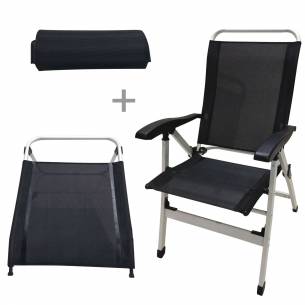 Pack CONFORT: compuesto de la silla de camping CONFORT, del reposacabezas CONFORT y del reposapiernas CONFORT. De tela trenzada y estructura de aluminio.