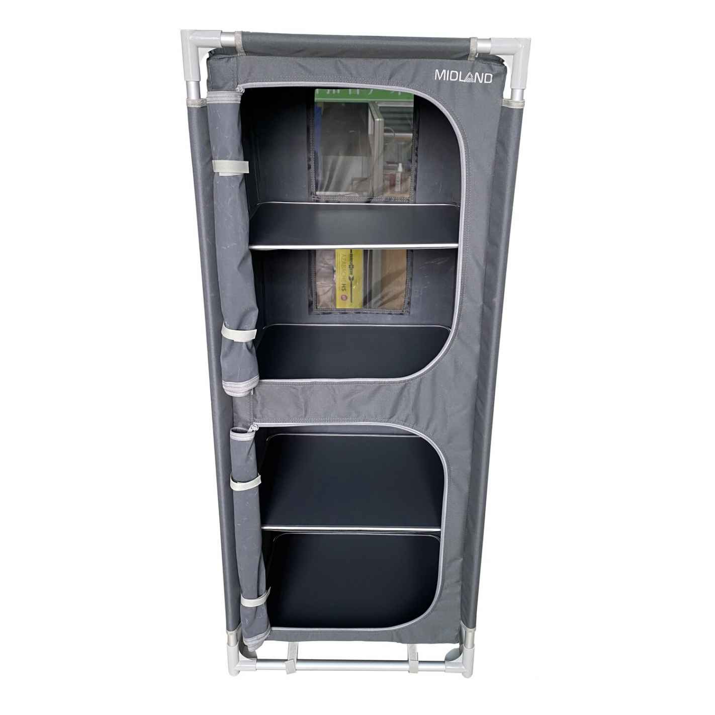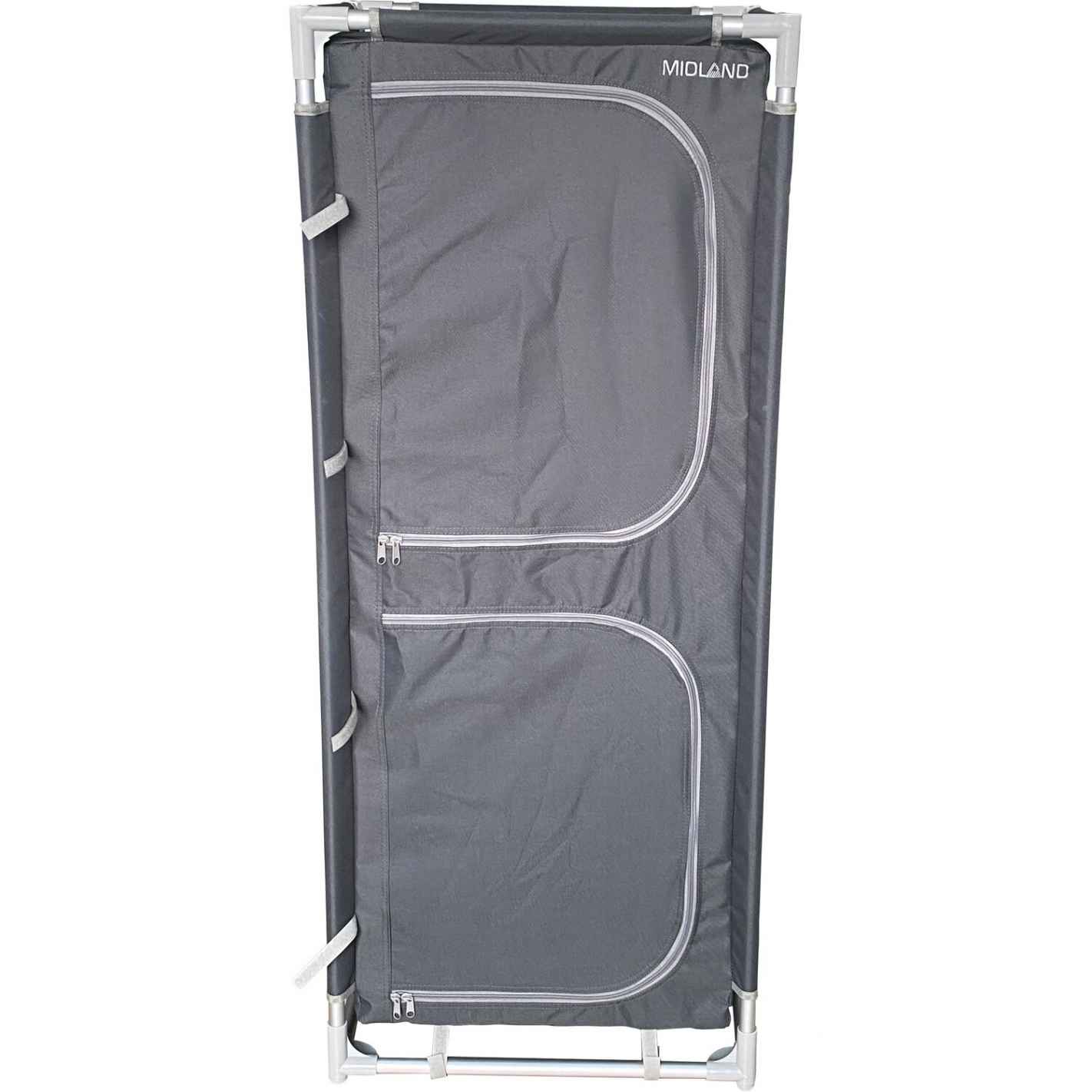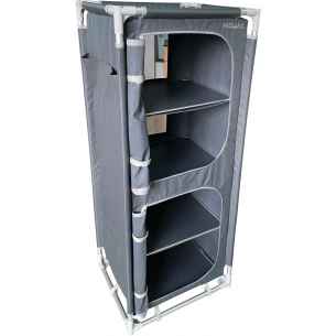 El mueble de almacenamiento Gamma de MIDLAND combina gran capacidad y formato plegable para un camping bien organizado. Con sus 4 estantes, bolsillos laterales, lona ventilada y patas ajustables, ofrece estabilidad, durabilidad y confort, incluso en plena naturaleza. Bolsa de transporte incluida