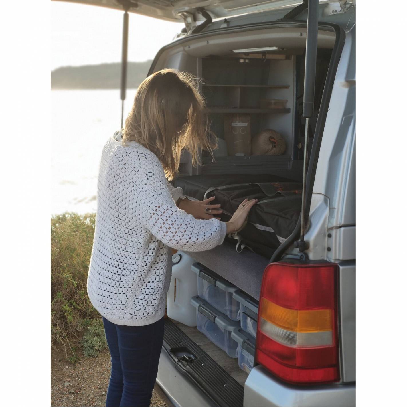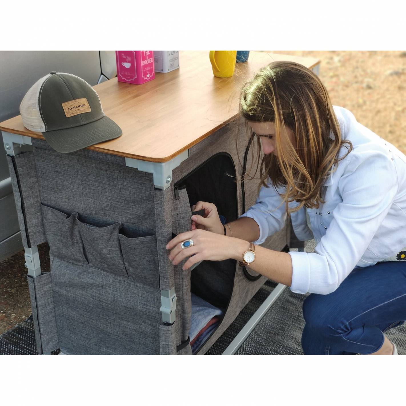 El mueble para camping Easyquick Bali de la marca Soplair es ideal para viajar en vehículos recreativos (autocaravanas, caravanas, furgonetas, furgonetas camperizadas...). De hecho, es muy compacto y se guarda fácilmente en su bolsa de transporte incluida. Además, es ligero, ¡así que puedes llevarlo donde quieras! El mueble de almacenamiento cuenta con un espacio óptimo con 4 estantes y pequeños bolsillos laterales. Así, puedes guardar lo que quieras en los estantes y bolsillos laterales (ropa, vajilla...) y colocar otras cosas encima. Este mueble de almacenamiento es muy útil durante las pausas en tus excursiones o cuando acampas.