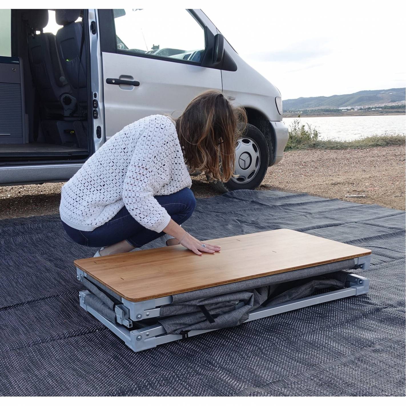 El mueble de almacenamiento Easyquick Bali está fabricado con materiales resistentes y ligeros a la vez para satisfacer las necesidades de los viajeros en vehículos recreativos. De hecho, el armazón es de aluminio con tubos cuadrados (25 x 25 mm) que es ligero y sólido al mismo tiempo. La lona con la que está fabricado el mueble de camping Easyquick Bali es de poliéster recubierto de PVC para favorecer una ventilación permanente y una mejor aireación. En cuanto a la bandeja, es de bambú: un material ecológico, sólido y fácil de limpiar. Su composición en términos de materiales le da un aspecto moderno y de diseño. Existe el mueble de almacenamiento Hanoï de la marca Soplair, que es más pequeño y está pensado como mobiliario de camping.
