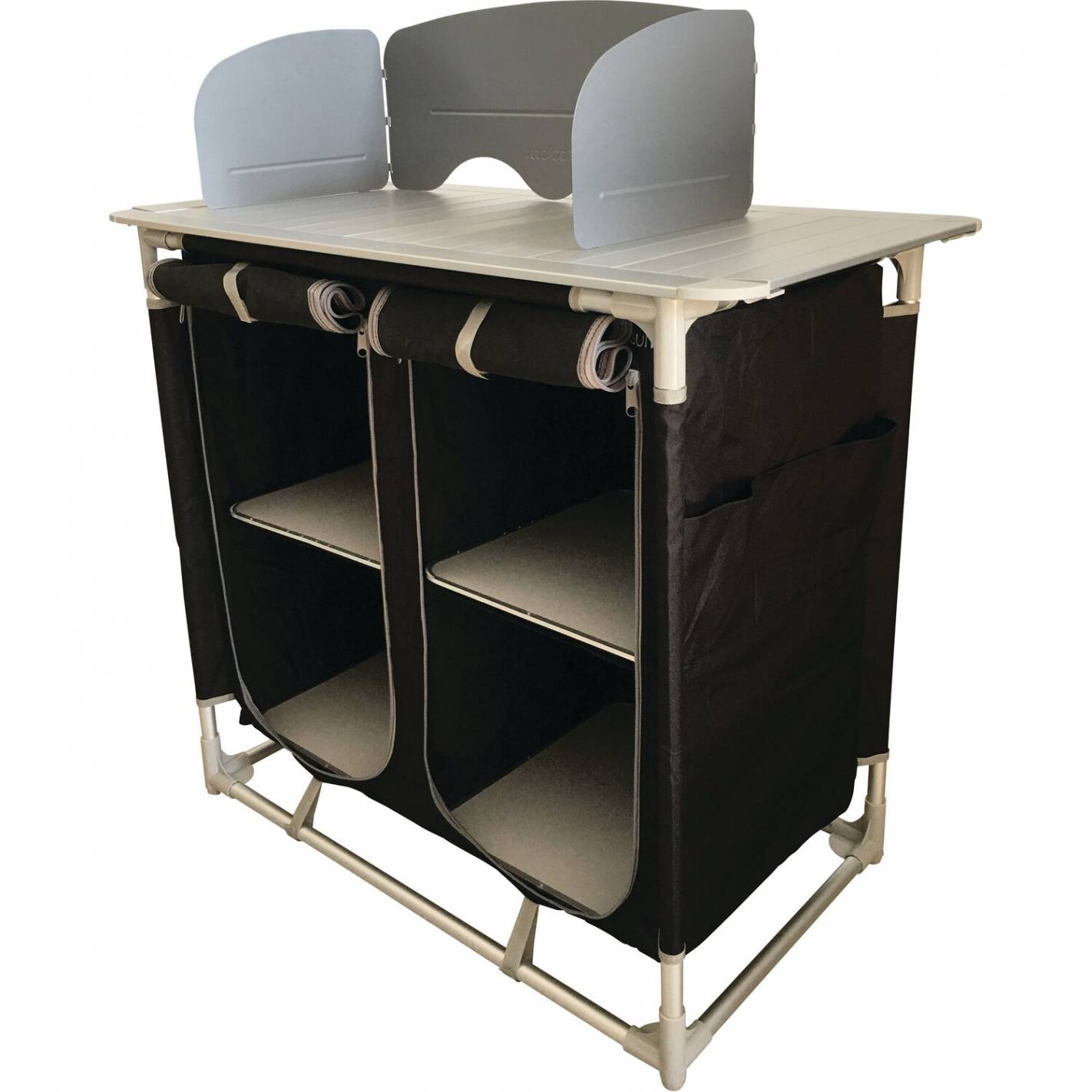 Los estantes son ideales para guardar todo tu equipo de cocina y camping. También puedes utilizar la superficie de trabajo para cocer a fuego lento comidas calientes utilizando un hornillo de camping. ¡Este mueble de camping puede soportar hasta 30 kg!