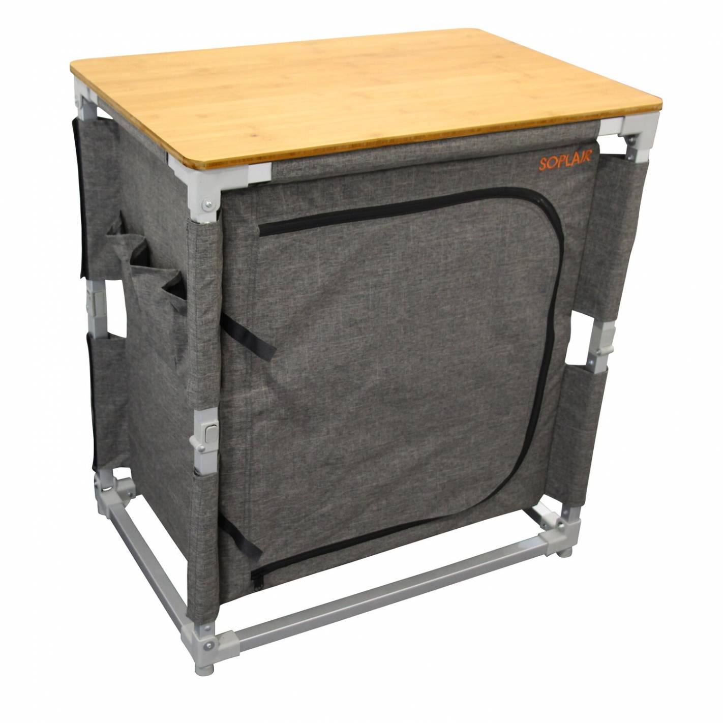 El módulo de almacenaje Soplair tiene una estructura de aluminio, que lo hace ligero y resistente al mismo tiempo. Con una tapa de bambú, el mueble es elegante y resistente. El tejido del mueble es de poliéster recubierto de PVC, lo que permite que el mueble respire continuamente. Se trata de una ventilación permanente.