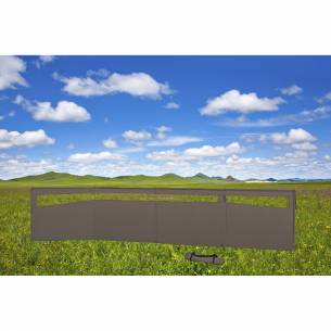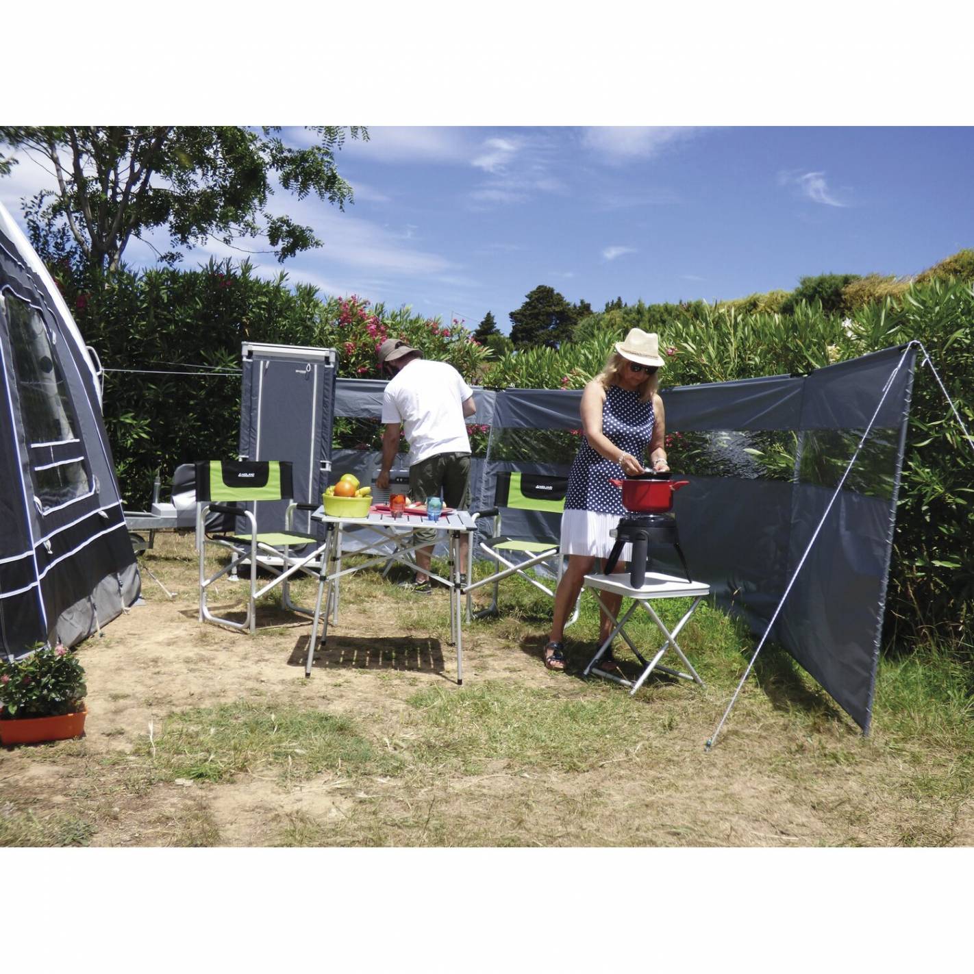 Tejido de poliéster + ventana de cristal. Estructura de acero. Cuerdas de sujeción y estacas suministradas. Color gris. Dimensiones : An 600 x Al 140 cm