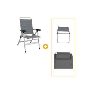 El pack incluye una silla de camping Comfort de aluminio gris Baya (RG-078788C) con reposapiernas (RG-078789C) y reposacabezas (RG-078710C ) a juego.